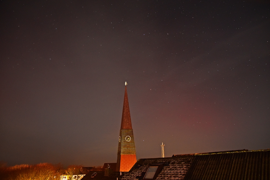 Schon recht früh vielen mir halbkreisförmig darüber einzelne rote Strahlenbündel auf. Erst als diese mit der Zeit immer höher stiegen, kam mir der Gedanke an einen SAR-Bogen. Die Fragmente breiteten sich aus und schlossen sich zu einem kompletten SAR. Die RAGDA wurde auch im Minichat gemeldet (Webcam Amrum-Norddorf bei 310°).