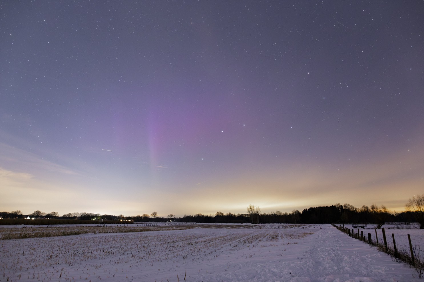 Schließlich bin ich bei Lübbecke verblieben (entspricht ca. 52.3°N) und habe oberhalb der Lichtglocke einer nordnordwestlich gelegenen Kleinstadt schwach visuelle Polarlichtstrahlen beobachten können, die sich auch noch gegen einen diffusen Zirrus-Layer behaupten konnten: