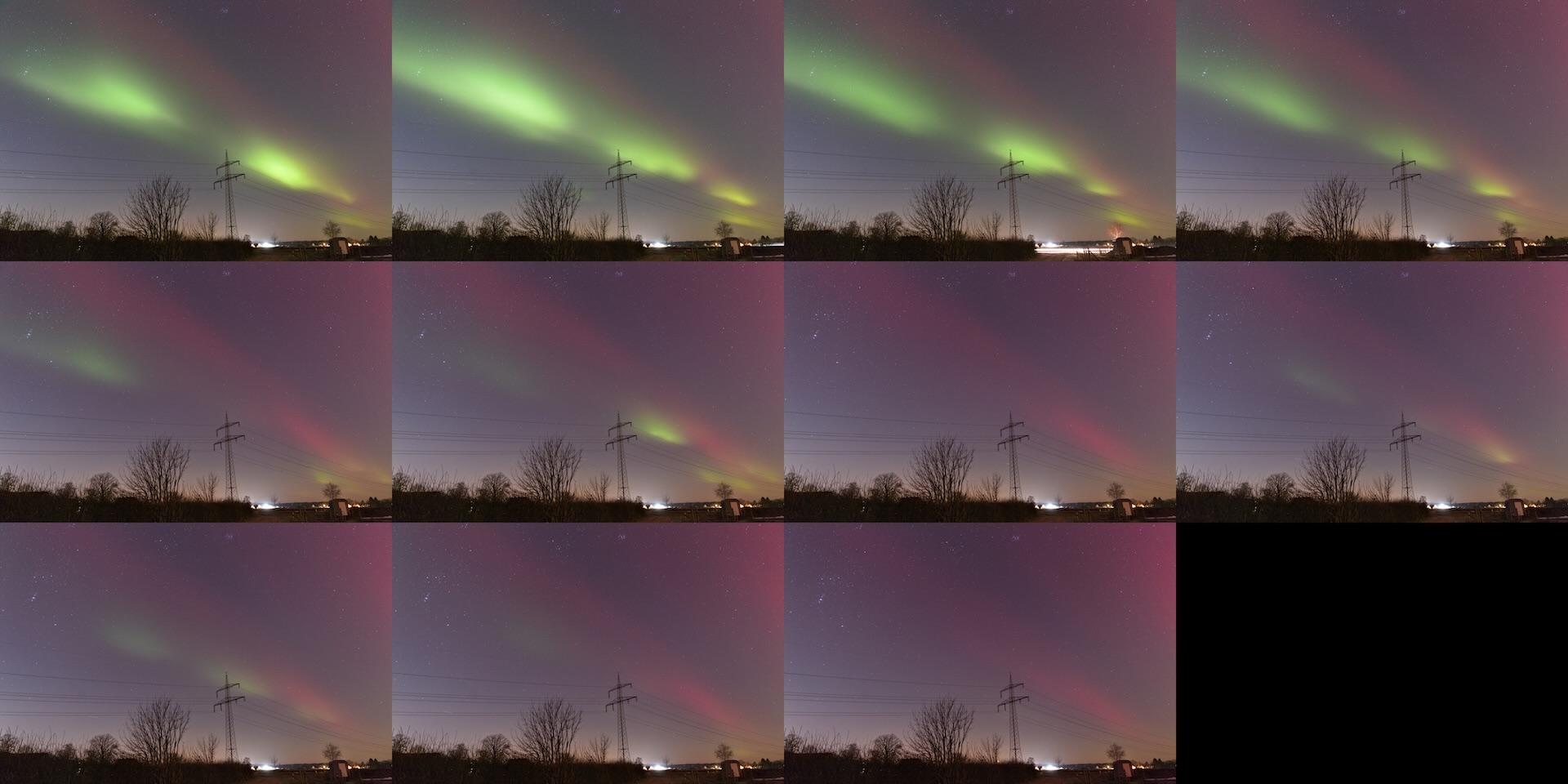Aus Büdelsdorf erkennt man, dass das rote Band abgesetzt ist von den grünen Vorhängen oder Einzelblobs (wenn man nah oder drunter ist). Und wie gesagt aus Frankreich erkennt man, dass die grünen südlicheren Zonen ebenso Strahlen obendrüber haben, die halt von näher schräg unten eher verschwinden, weil sie keine ausreichende Leuchtdichte erzeugen.