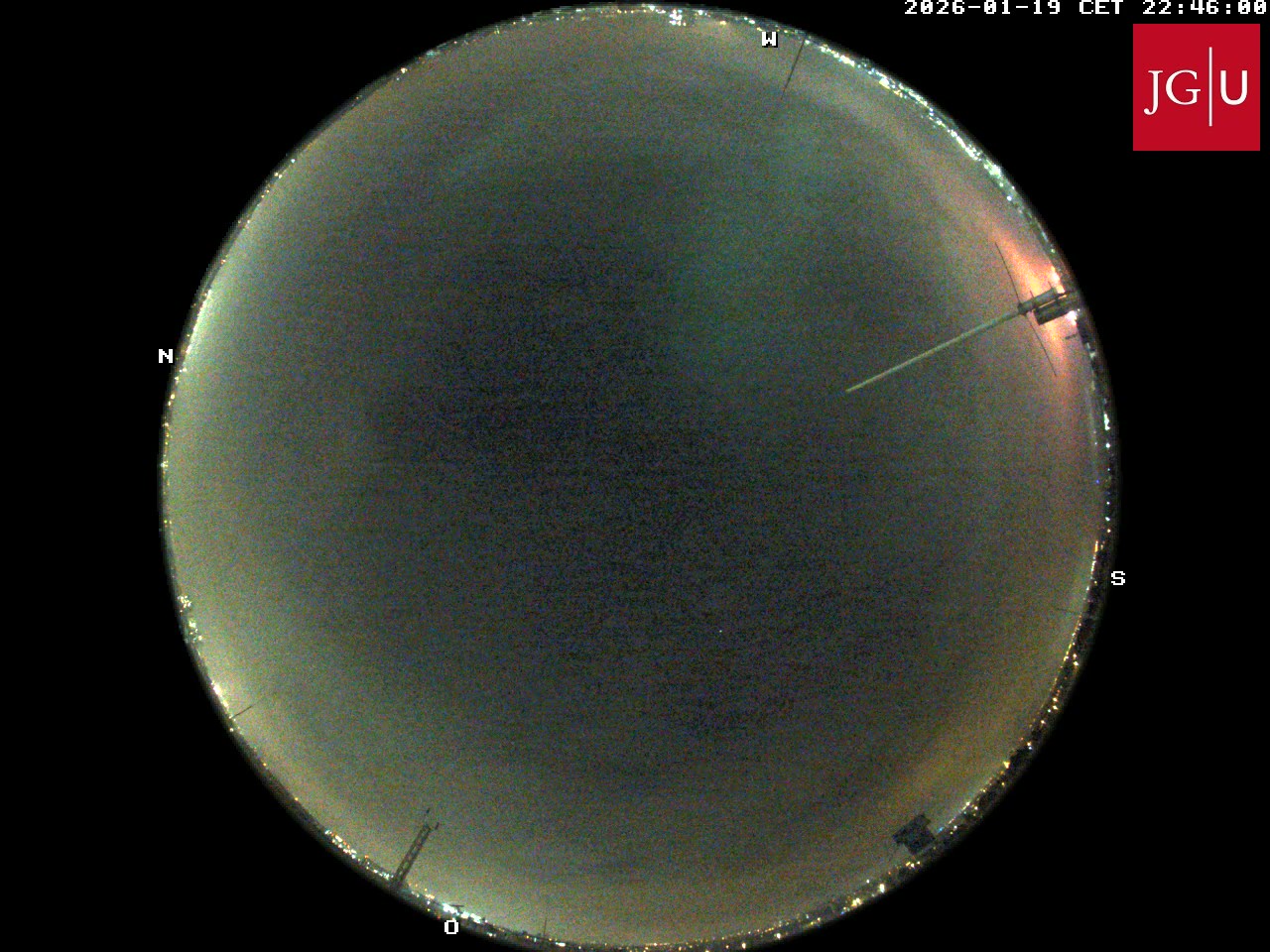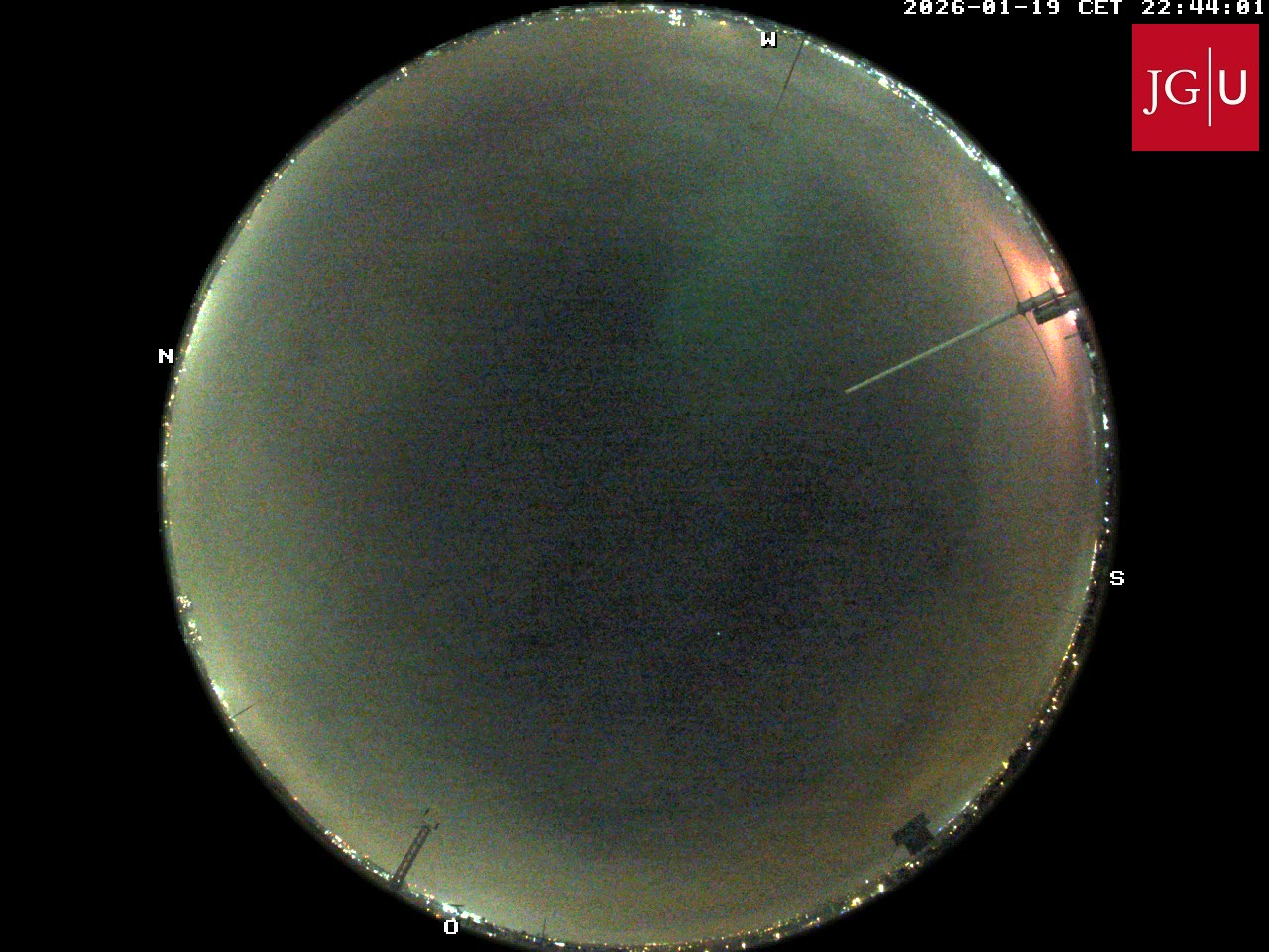 Meine grüne Linie, die ich auf der Webcam in Mainz um 22:48 im Zenith zwischen Nebel beobachtet habe, taucht auch in Büdelsdorf auf. Sie ist sporadischer aktiv und vor allem rechts im Südbild weiter entfernt immer mal zu sehen. Inzwischen sehe ich auf anderen Bildern (1-min-Turnus) von der Webcam Mainz weitere Spuren dieser Linie, die so ab Mainz westwärts leuchtet. Mainz liegt relativ genau unter dem Stern Rigel vom Orion, von Büdelsdorf aus gesehen. Und inzwischen habe ich auch Spuren von "Deiner" Linie auf der Mainzer Webcam entdeckt. Jetzt weiss ich eben, worauf ich achten muss.