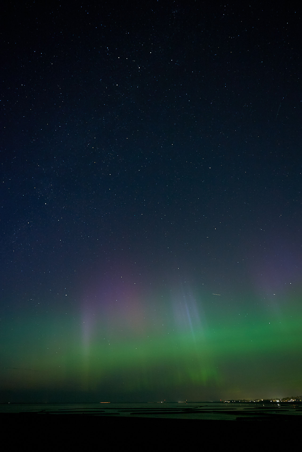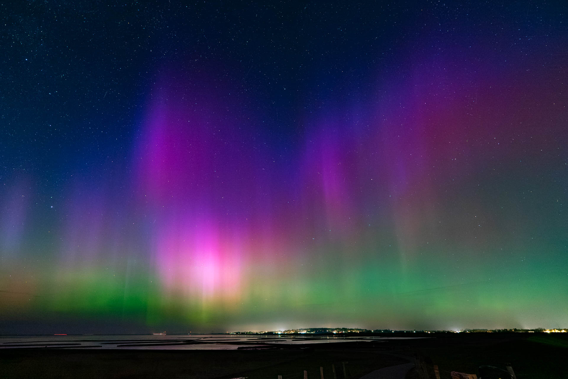 Ich habe bisher nie die blauen Bereiche ganz oben am Polarlicht gesehen. Aufgenommen in 25813 Husum am Dockkoog. Der Blick geht in Richtung Schobüll und Nordstrander Damm, also ziemlich genau nach Norden.
