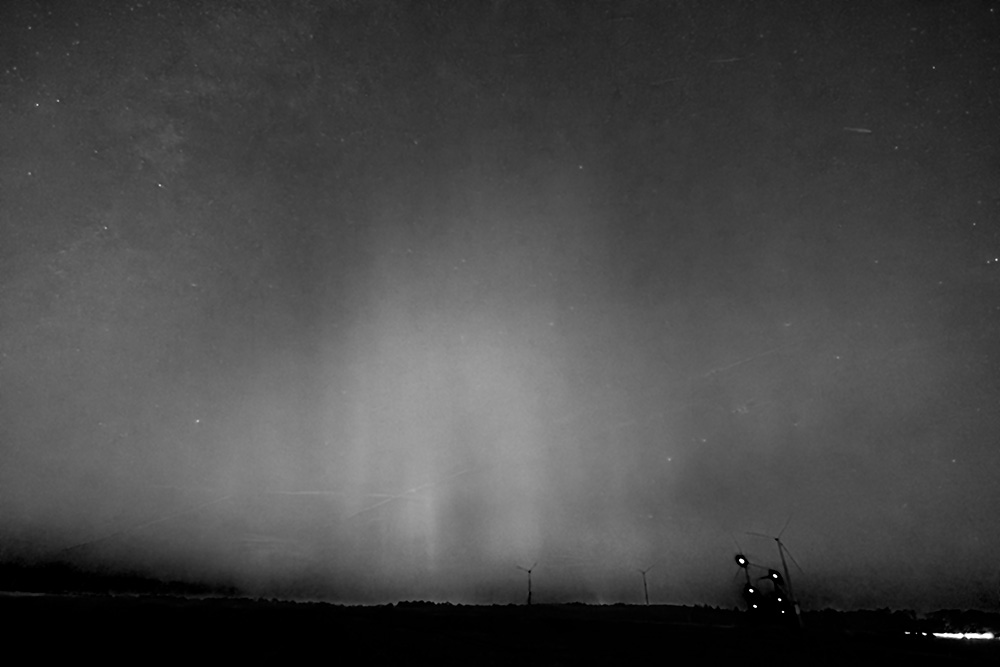 Das erste Bild stammte von 18:37 MEZ, kurz nach dem ersten Substurm (den ich knapp verpasst hatte). Da kann man schon deutlich blaues Polarlicht sehen. Das würde in etwa mit der Zeit von weiter oben passen: Ich habe mal mit Hilfe eines Filters (Staub und Kratzer entfernen) die Sterne abgeschwächt, sodass die Polarlichtstrahlen noch besser hervorkommen: Und einmal nur der blaue Kanal: Das blaue Polarlicht gab es dann nochmals beim Substurm gegen 20 Uhr MEZ deutlich, man kann sogar gut erkennen, wo die Sonne hineinscheint. Hier das Bild, wo die Sterne bereits abgeschwächt sind: Und nur der blaue Kanal: Da scheinen wohl einzelne Strahlen dabei zu sein, die wohl sehr hoch reichen. Wie hoch, könnte man mit Hilfe von Triangulation bestimmen. Vielleicht hat ja noch jemand ein paar Bilder von dem Abend (wovon ich mal sehr stark von ausgehe