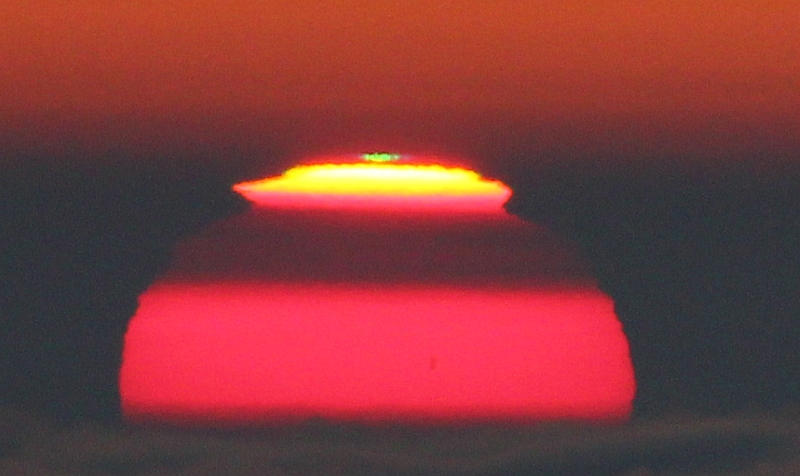 eigentlich ist man nach einem Nachtdienst froh, wenn man endlich heim kann. Aber am Morgen des 4.09. habe ich aufgrund des herrlichen Erdschattens und der intensiven Gegendämmerung auf dem Fichtelberg/Erzgebirge kurz vor Sonnenaufgang noch ein paar Fotos gemacht. Die Sonne ging dann über Wolkenmeer sehr verzerrt auf (wäre ein super Fall für die Russentonne gewesen), so daß ich auf die Schnelle noch wenige Male in Sonnenrichtung abdrückte. Daheim war dann die Überraschung groß, als ich auf einem Foto den grünen Strahl entdeckte. Auch, wenn das herausvergrößerte Bild nicht mit einer 1000mm-Aufnahme mithalten kann, so ist es doch wie ein Sechser im Lotto...
