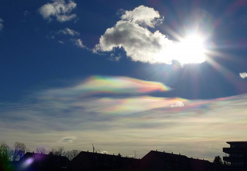 das was du uns hier zeigst ist kein Irisieren, sondern eine Nebensonne. Dabei wird das Licht der Sonne an hexagonalen Eiskristallen gebrochen.