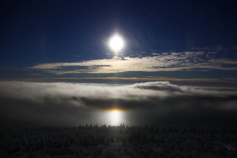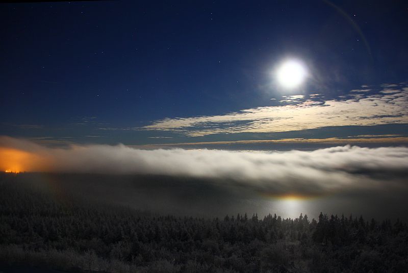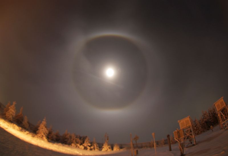 ich glaube, die Schneekanonen hatten nur einen kleinen Anteil am Halo, wenn überhaupt. Die Richtung war nur zufällig in Richtung der Schneekanonen. Aber sowohl das Mondhalo als auch mein Halo heute morgen kamen eindeutig mit dem Nebel aus dem Böhmischen Becken rübergeschwappt. Die Windrichtung lag bei Südwest. Ich war letzte Nacht in den Wolken der Schneekanonen drin, da war überhaupt nichts. Damit Schneekanonen auf Halos Einfluss haben, müssen die Kristalle reifen. Das klappt in Tälern wie Davos, vielleicht auch im Böhmischen Becken, wenn man von Neklid aus rein läuft, aber nicht bei Windstärke 6 auf dem Fichtelberg. Ich bin dahingehend noch immer skeptisch.