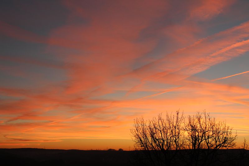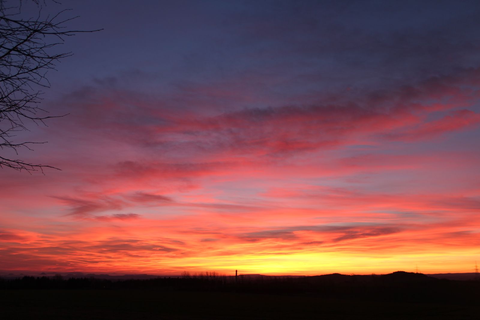 Sonnenaufgang gegen 8 Uhr MEZ vom Lerchenberg bei Possendorf (nahe Dresden), zur Einordnung links Elbsandsteingebirge, rechts Osterzgebirge, Landschaft alles sehr duster, aber die Farben sehr intensiv (nicht nachbearbeitet) Heute Kameraspeicher ausgemistet.
