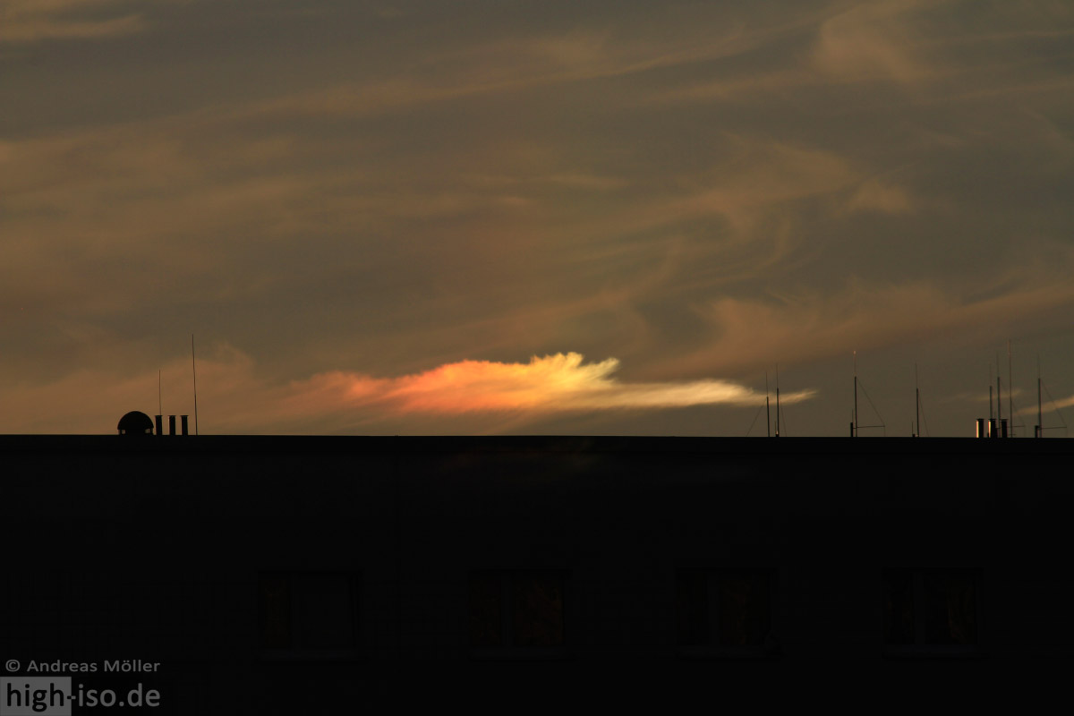 auch ich konnte in Berlin von meinem Balkon aus die wunderbaren Halos beobachten. Zu sehen waren nur die Nebensonnen. Dafür strahlten sie teilweise sehr hell (kein H3) und in den prächtigsten Farben. Zeitgleich gab es starkes Irisieren in Abstand bis etwa 15°. Alles in allem war das ein wirklich nett anzusehendes Himmelsschauspiel.