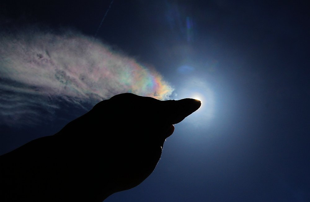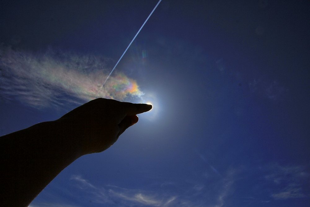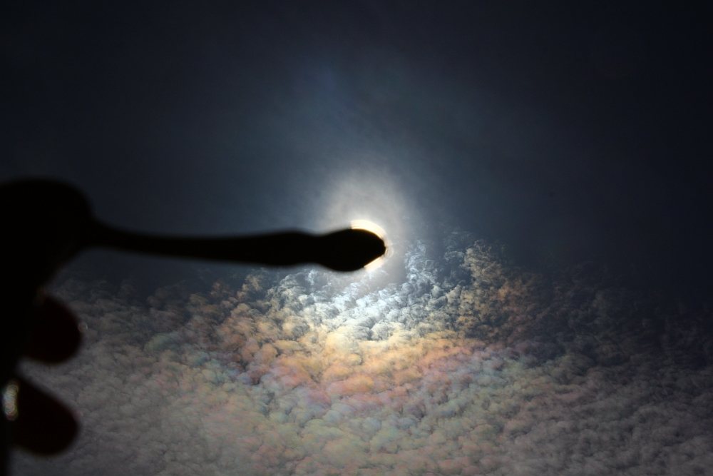 Aber eigentlich gab es kurz zuvor ein gutes Omen am Himmel. Mein "Personal Jesus" erschien am Himmel (Richard, Du kennst ja seinen Namen *grins*) und zeigte in Richtung Sonne. Es war also klar, dass da irgendwas kommen musste! Und dann kam halt das Irisieren und die Miniringe. Da meine Wurstfinger schon fast die Ringe verdeckten, versuchte ich die Sonnenabdeckung mit einem Kaffeelöffel hinzubekommen. Hier mal noch zwei andere Bilder Wenn es wirklich welche sind, dann waren Elliptische Ringe, Irisieren und Ring von Bishop gleichzeitig.