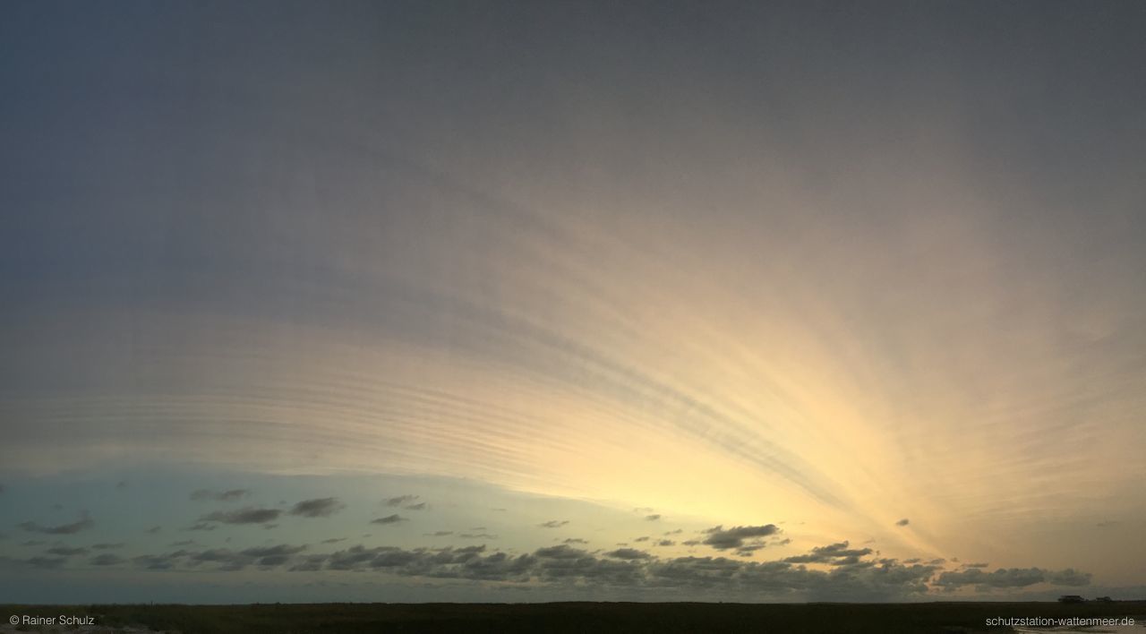 Lauras Beobachtung kann ich bestätigen, auch wenn ich keinen Fotoapparat zur Hand hatte. Zu Sonnenuntergang zeigten sich in milchigem Himmel die schon beschriebenen Rippenstrukturen. Später dann gelbliches Licht am Horizont und violettes in der Höhe.