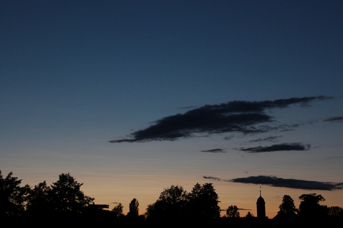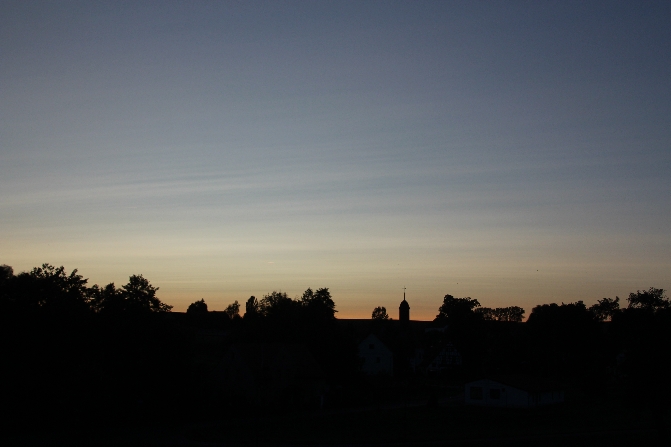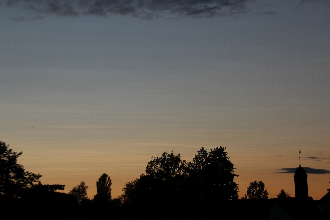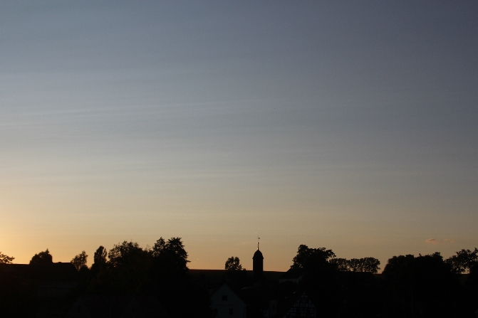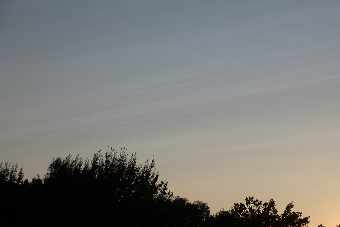 Heute abend kurz nach Sonnenuntergang waren wieder die "Streifenwolken" zu sehen. Allerdings haben sie sich, im Gegensatz zum vorhergehenden Mal, verändert und sind eine Weile am Himmel "stehengeblieben". Es machte auf mich als Laie kurz den Eindruck, als ob es sich doch um "Schleierbewölkung" (wie bereits hier vermutet: Cirrostratus) handeln könnte.