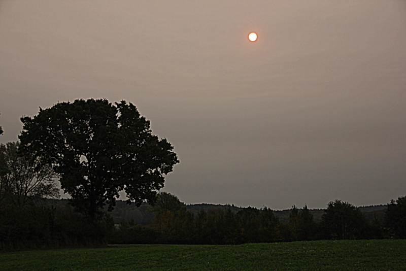Um 17.45 Uhr war ich dann noch mal draußen, um die "Staubsonne" zu fotografieren: Kurz danach wurde die Sonne verschwommener, anscheinend war im Westen noch Cirrus, den man aber aufgrund der Lufttrübung nicht erkennen konnte.