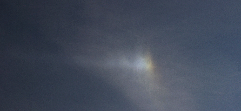 Um 8:00 ist mir eine recht hohe (20°) wenn auch schwache Lichtsäule aufgefallen (Sonnenstand +3°) Wenig später kamen noch 22°Ringsegmente und der OBB dazu. Noch etwas später beide Nebensonnen (linke kurz H2). Die Nebensonnen sind als letztes um 9:30 verschwunden. Nach einem ZZB konnte ich leider von meinem Arbeitsplatz nicht ausschauhalten. Um 9:00 war aber draußen keiner zu sehen.