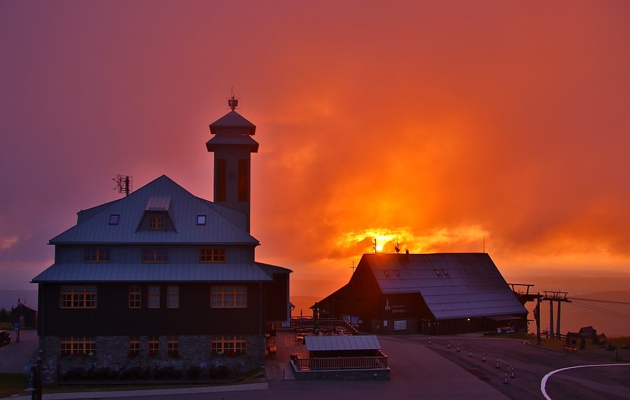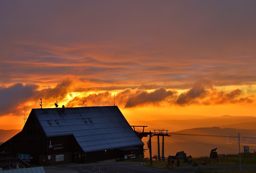 Morgenrot im Nebeltreiben am 15.08.2018 auf dem Fichtelberg