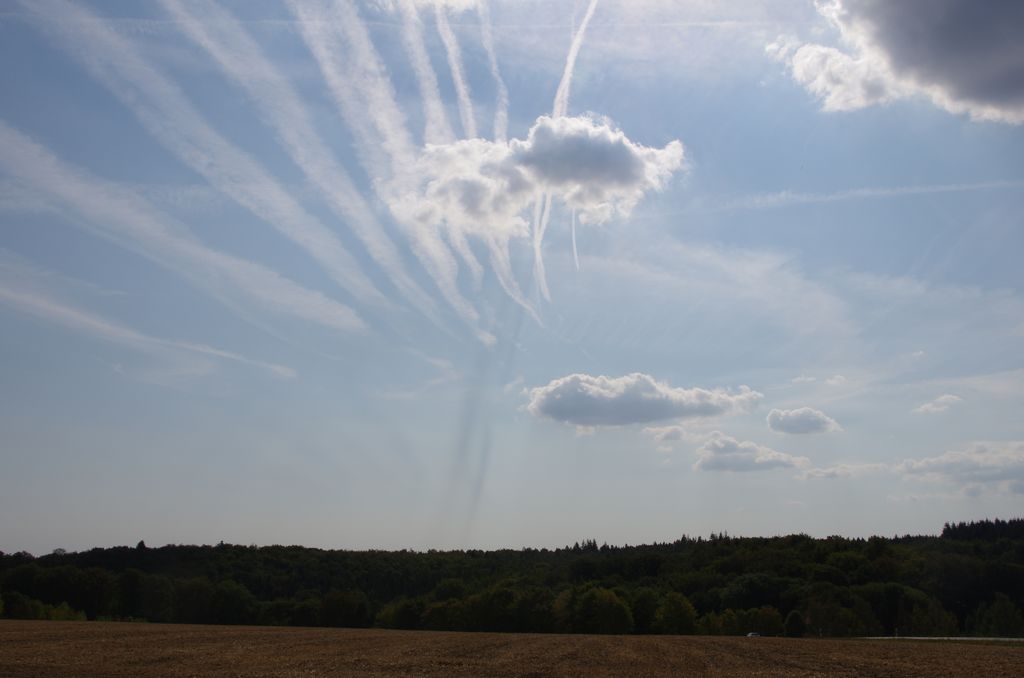 heute knapp vor 10 Uhr eine besondere Ansammlung von Kondensstreifen mit intensivem Schattenwurf und zeitgleich auf dem Acker ein Staubteufel.