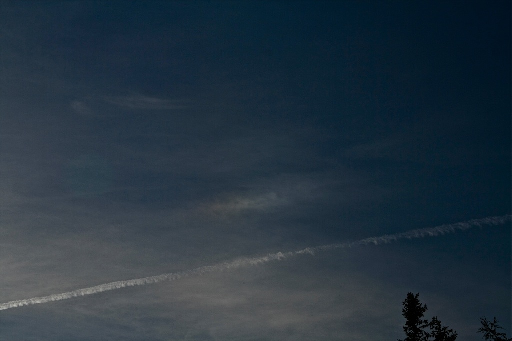 im gegenwärtigen Azorenhoch über Mitteleuropa ist der Himmel ständig mit Schlieren von Cirren hier und da verhangen. Aussichten auf optische Phänomene sollten da vielversprechend sein, aber es tat sich gestern mit Ausnahme einer leichten linken NS so gar nichts an den Eiswolken, noch nicht einmal der Mond, der leicht verschleiert war, zeigte etwas auffallendes.