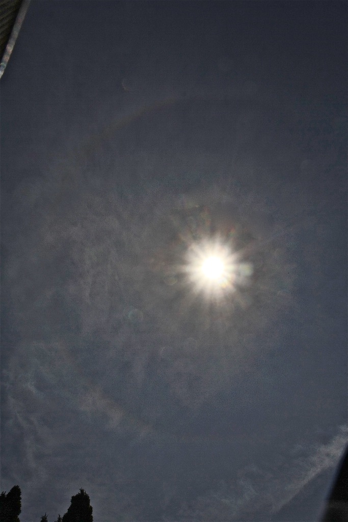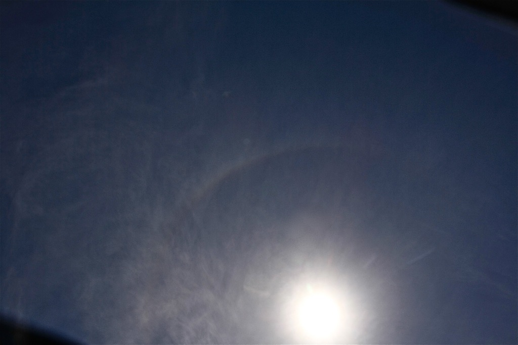 um 11:52h MESZ zeigte sich südl. von Wien ein 22° Halo sehr kurzfristig. Es weht ein strammer Südostler mit 55Km/h in Böen, bei 18°C und 40% RF, Kondensstreifen lösen sich sofort wieder auf. Luftdruck beträgt 1011mb und fällt beständig.