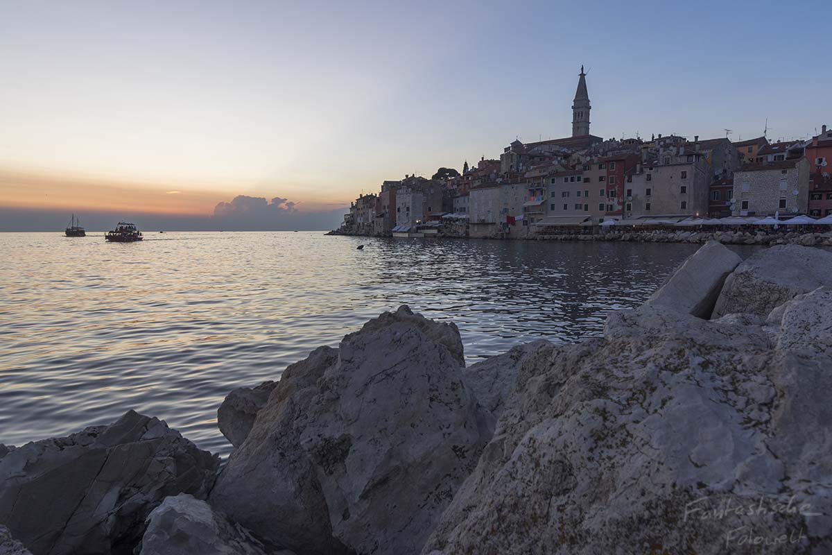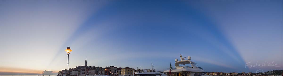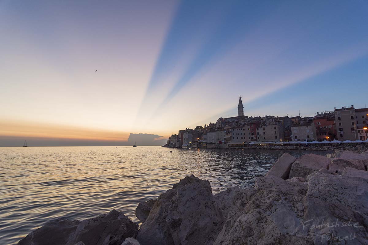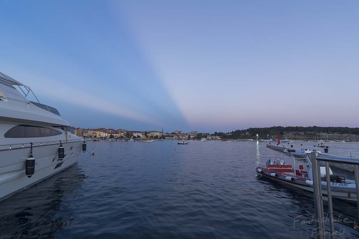 Am 30.07.2019 gab es dort zum Sonnenuntergang sehr intensive Dämmerungs- und Gegendämmerungsstrahlen. Zum Glück haben wir sowieso vorgehabt, den Sonnenuntergang in Rovinj zu fotografieren, sodass die große Kamera samt Ultraweitwinkel dabei war.