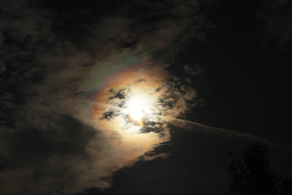 die Kondensstreifen zogen heute den ganzen Himmel zu - dabei kamen manch kuriose Gestalten heraus und der Mond zeigt sich durch eine Korona.