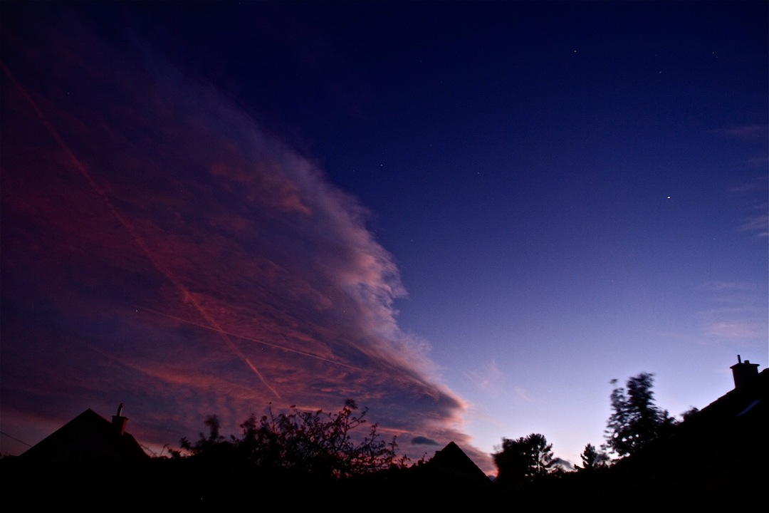 Gestern Abend zeigte sich ein auffälliges Purpurlicht. Diese angenehmen Sonnentage im zentraleuropäischen Hoch sind wahre Wohlfühlwettersituationen, trockene Luft, keine Schwüle und bleierne Schwere, Zimmertemperaturen, kühle Nächte zum Durchschlafen,laue Lüftchen und sternenklare Nachthimmel.