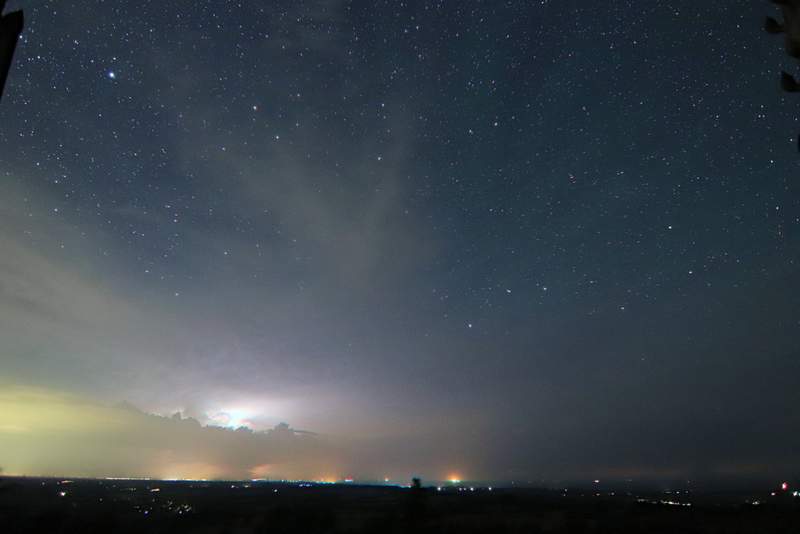 bin gestern Nacht mit der Hoffnung auf Polarlicht zum benachbarten Aussichtsturm "Hessenstein" gefahren. Polarlicht war nix, dafür aber tolles Wetterleuchten der nach Norden abziehenden Gewitterfront. Dazu gesellte sich auch etwas grünes Airglow.