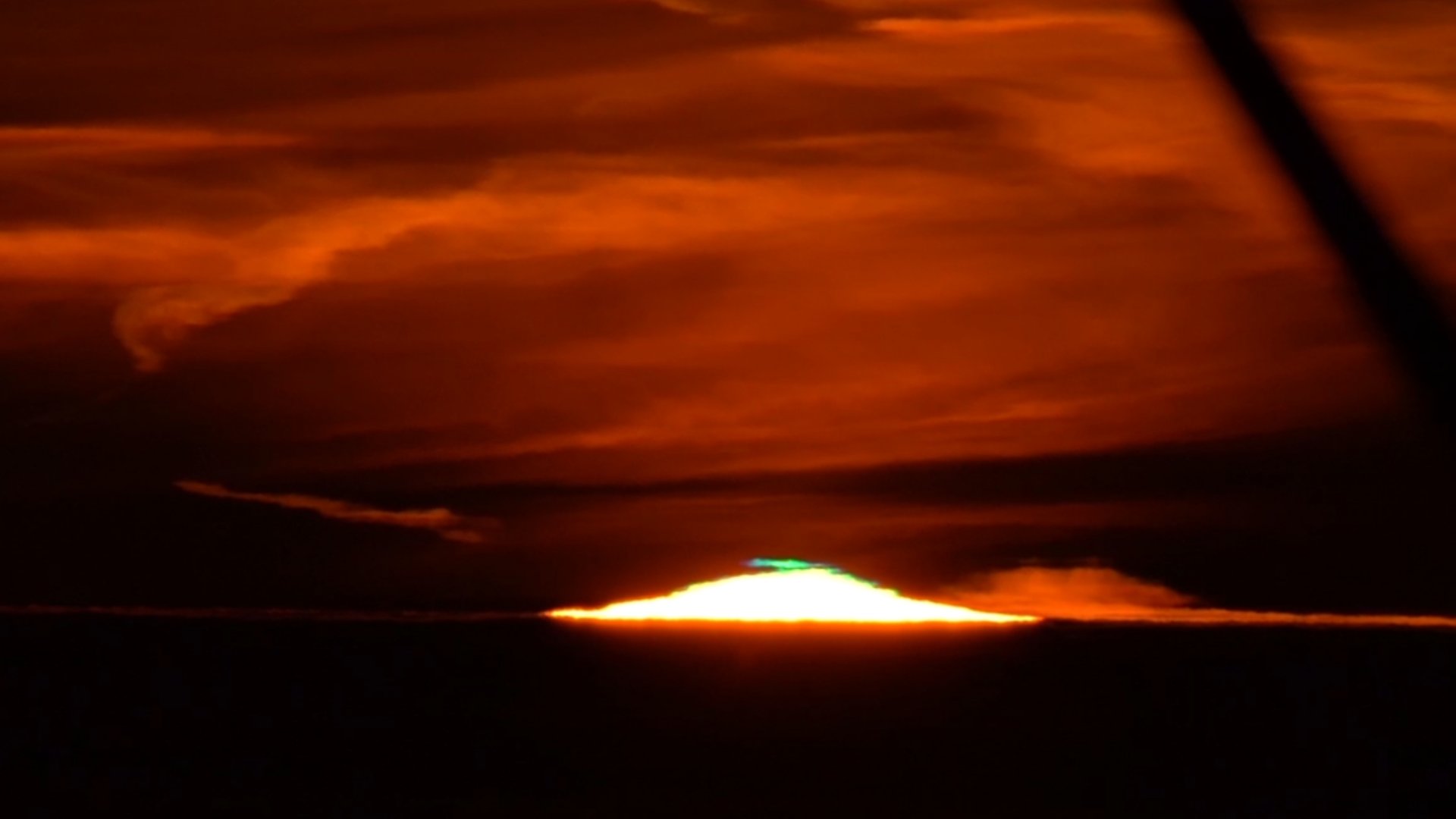 Gestern habe ich mal pauschal den Sonnenaufgang gefilmt und da habe ich doch glatt einen grünen Strahl mit erwischt.