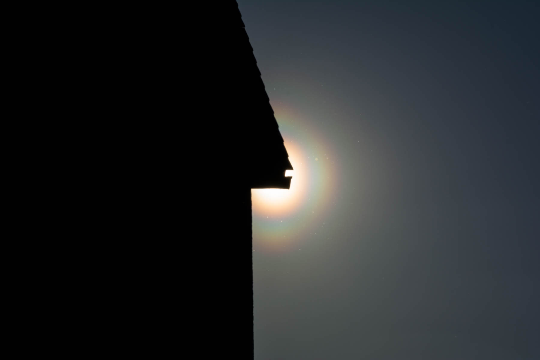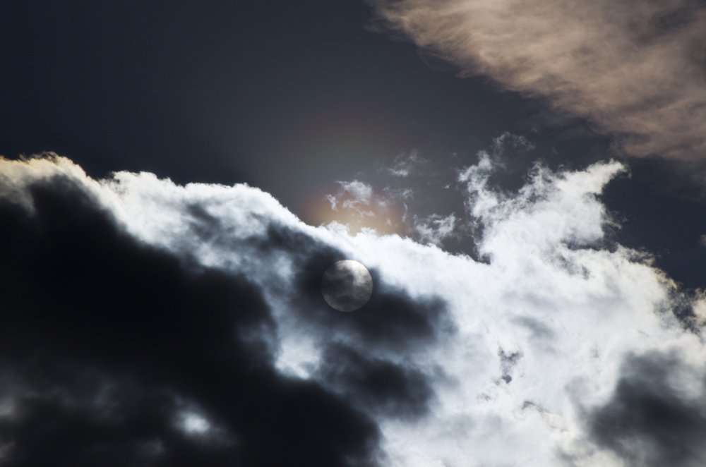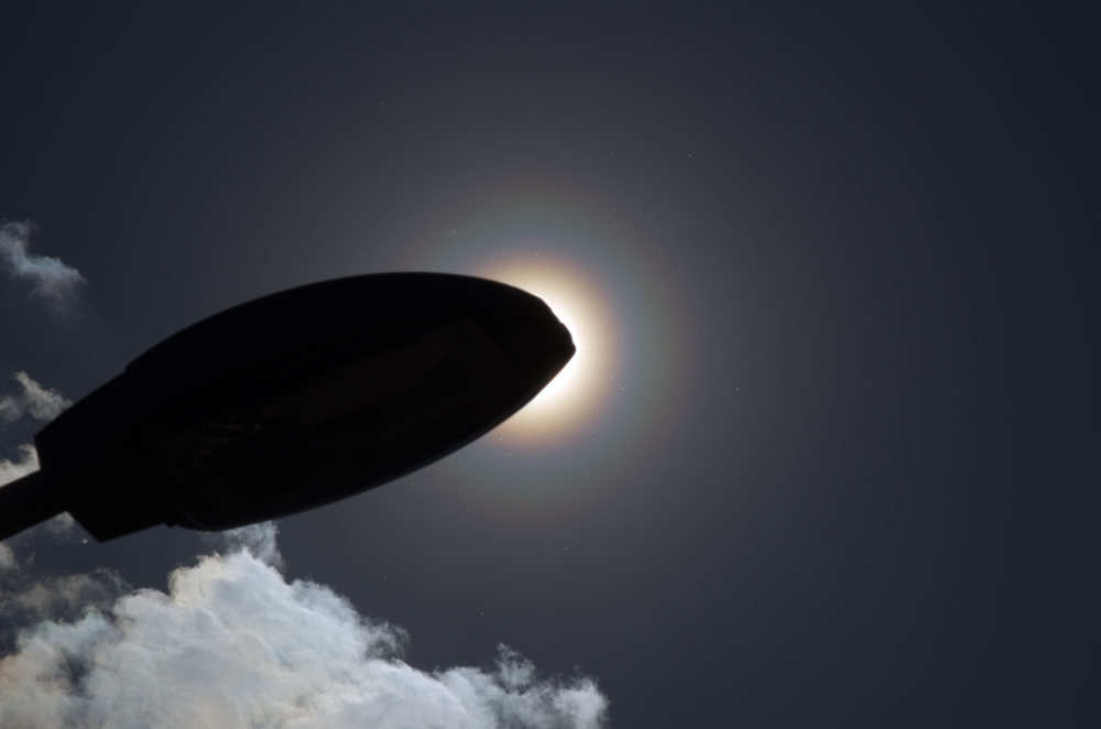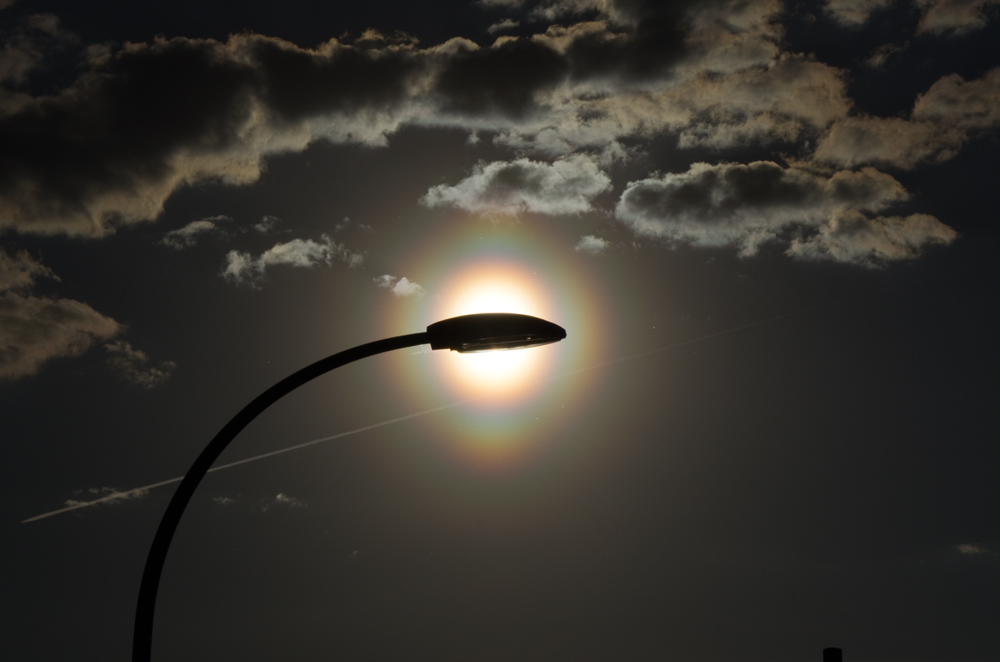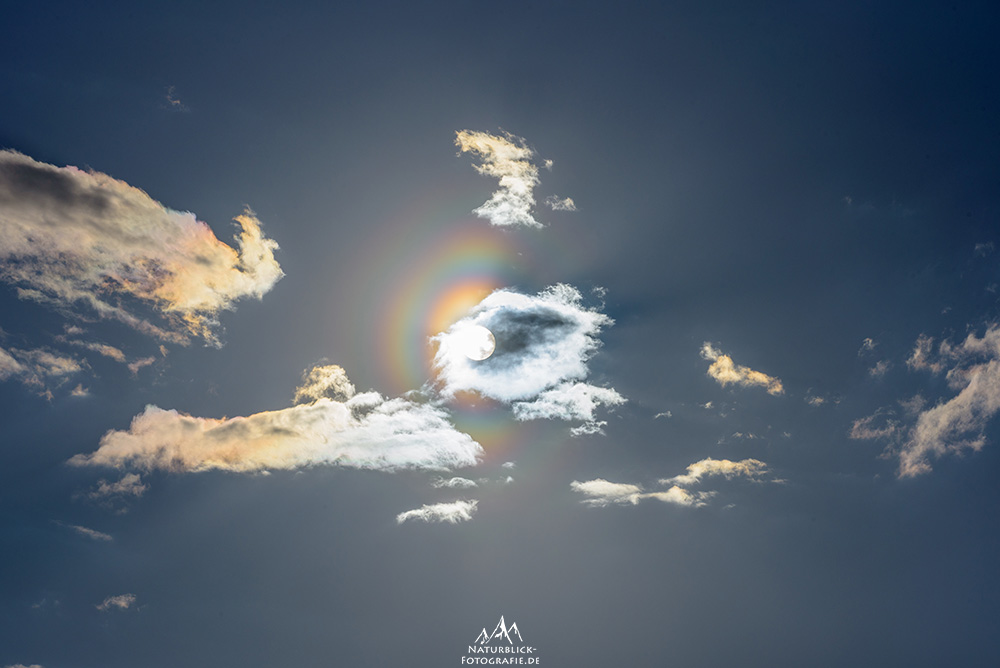 Später auf der Heimfahrt konnte ich aus dem Auto die Pollenkorona immer wieder sehen und diesmal waren die typischen Knoten schon deutlicher auszumachen. Also hab ich ein schönes Beobachtungsplätzchen bei Göppeln nahe Dresden gesucht. Als ich fotografiert habe, zogen kleine dünne Wolken vor die Sonne und ich bekam die Korona mit ein bisschen Irisieren und Schattenstrahlen vor die Linse: