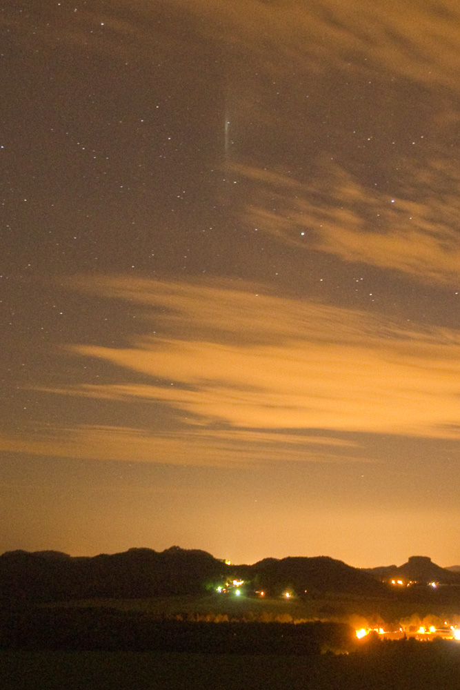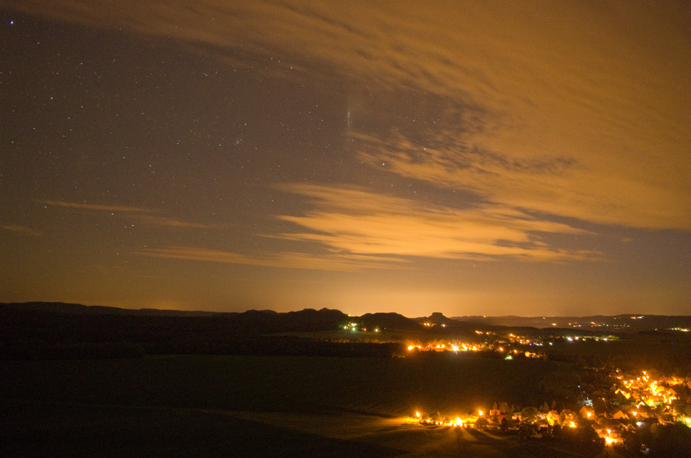 am Himmelfahrtstag hat die Haloaktivität in Brandenburg/Sachsen tagsüber nur für einen 22°-Ring gereicht, zumindest dort wo ich war. Nachts habe ich vom Zirkelstein für ca. 10 Minuten aber noch eine Höhenlichtsäule sehen können, genau über der Festung Königstein (wo es wohl auch passende Lichtquellen geben dürfte). Hier ein Bild von 23:30 MESZ: