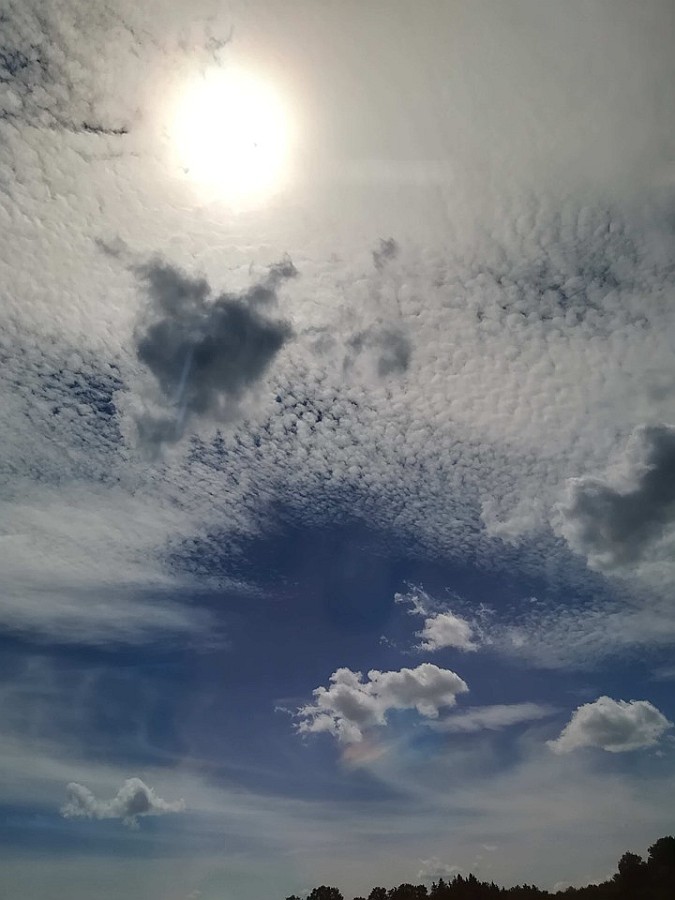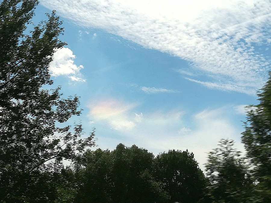 Bei meinen Himmelskontrollen bemerkte ich erstmals um 13:25 MESZ einen rötlichen Bereich westlich und unterhalb der Sonne. Mir erschien der Halo leicht gebogen und tippte auf einen Infralateralbogenabschnitt. Etwas später ab 13:32 MESZ zeigte sich eine kleine Cirre leicht rötlich und deutlich tiefer gelegen als der ILB unter der Sonne. Bis 13:46 ließ sich dieser Abschnitt verfolgen.