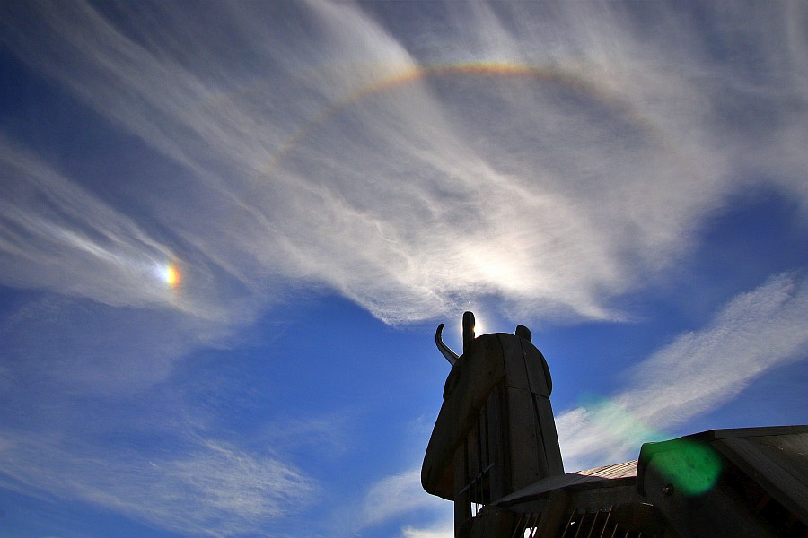 Es begann um 10.25 MEZ mit einem Horizontalkreisfragment im rechten 120°-Bereich. Dann zogen die Cirren schnell in Richtung Sonne und z.T. helle und farbenprächtige Nebensonnen, 22°-Ring und oberer Berührungsbogen gaben sich die Klinke in die Hand. Auf dem Gipfelweg zeigte sich an jeder Kurve ein anderes Bild und ich habe wohl noch nie so lange bis nach oben gebraucht