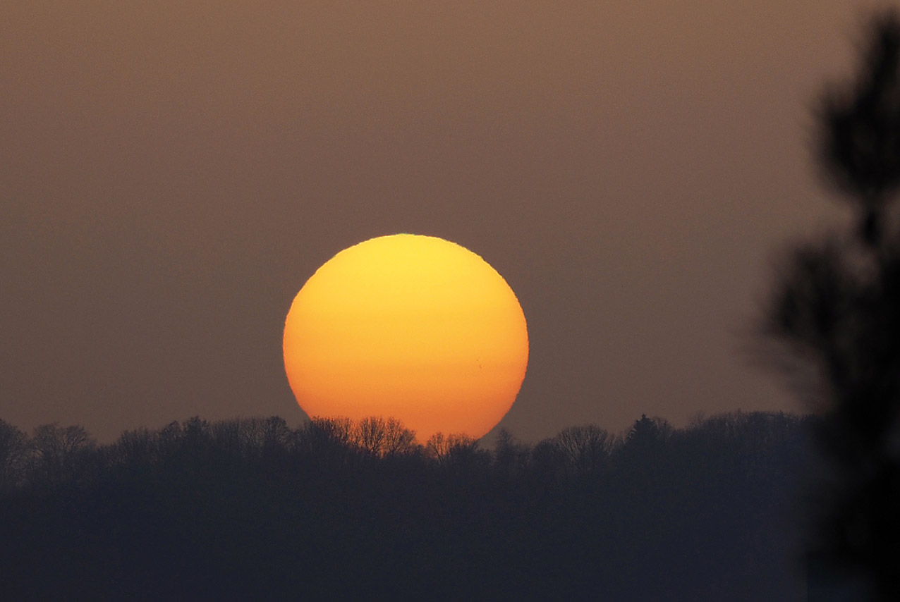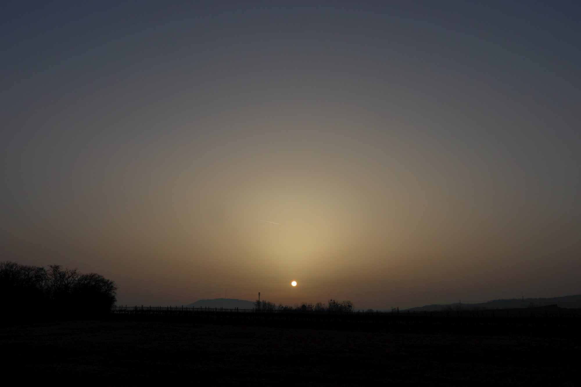 heute kam in den Nachrichten, dass sich Saharasand in der Atmosphäre befinden soll und dass deshalb die Sonnenauf- und -Untergänge farbiger ausfallen könnten. In Dormagen habe ich das Gegenteil beobachtet: Die Lichtstimmung war fahl, der Himmel grau, und die tiefstehende Sinne war schwach im Dunst und ganz farblos. Sowohl der Sonnenaufgang als auch der Sonnenuntergang waren heute eher farblos. Den ganzen Tag wurde es nicht richtig hell, obwohl der Himmel fast wolkenlos war. So was habe ich zuletzt gesehen, als der Vulkan auf Island ausgebrochen war.