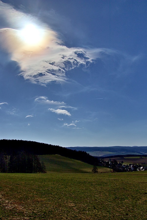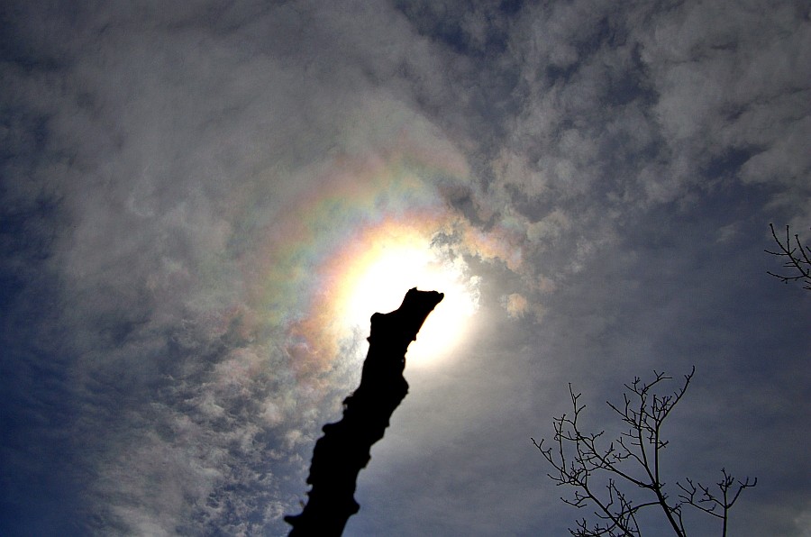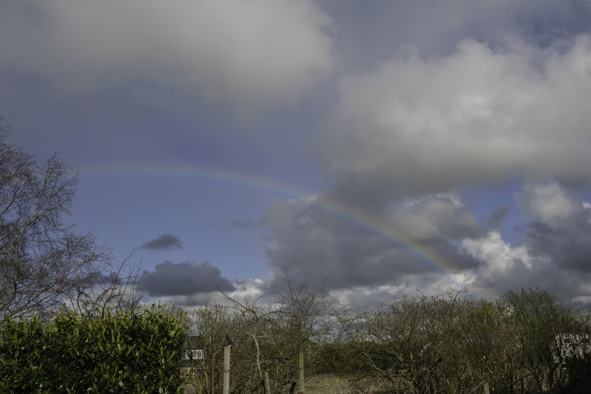 Endlich auch bei uns mehr Dynamik am Himmel. Mein erster Regenbogen dies Jahr am späten Nachmittag. Mittags zeigte sich ein Irisieren über einer Haufenwolke.