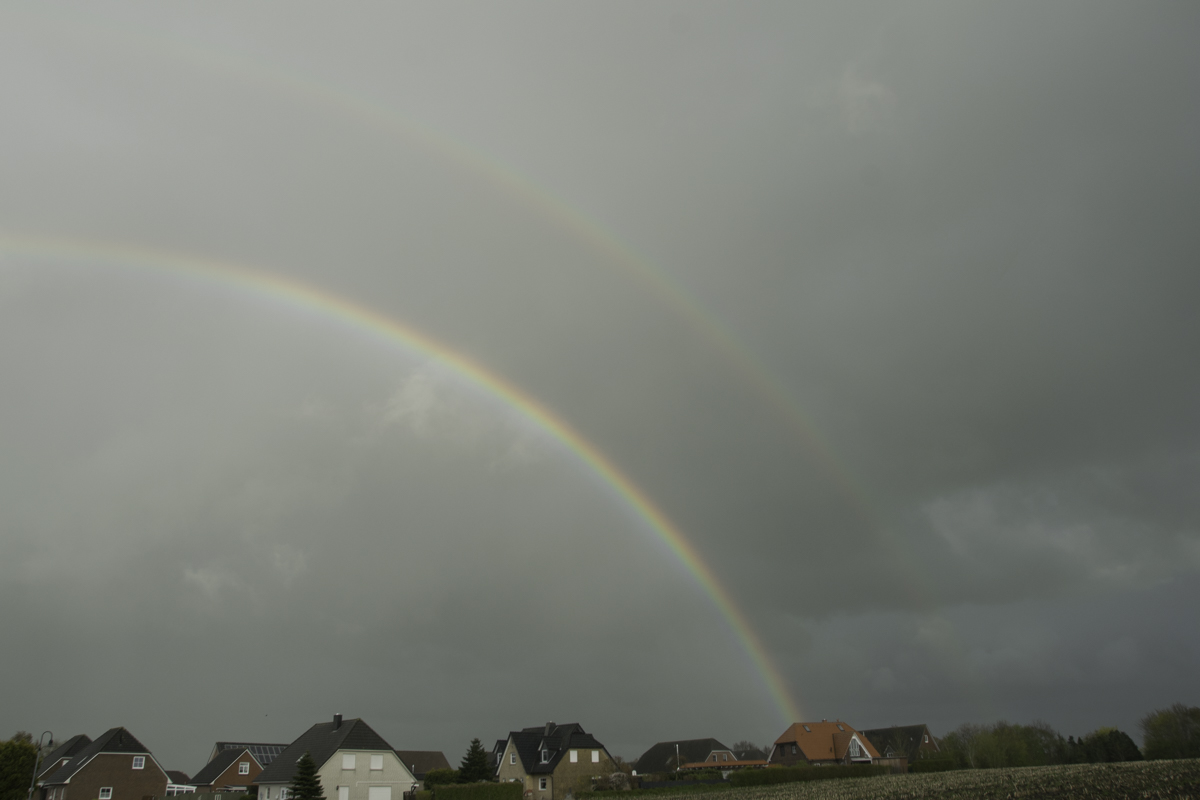 ich suchte das Samyang 18mm für vollformat, montierte es an der kamera und eilte in den 2. stock um den regenbogen als ganzes festzuhalten in den knapp 4 minuten zwischen den aufnahmen hatte sich der schwach visuell ichtbare 2. regenbogen links drüber aufgelöst...