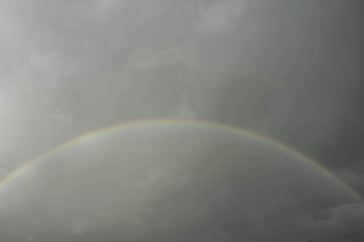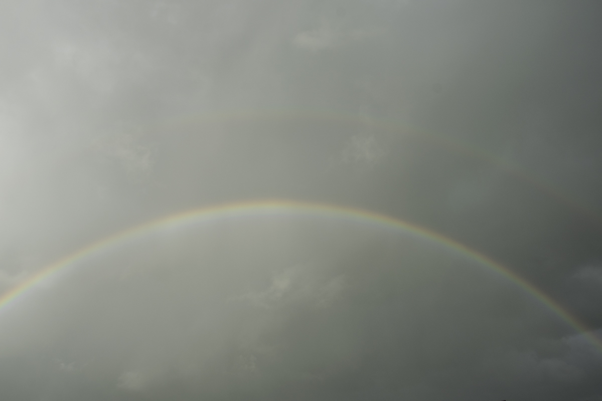 gestern konnte ich bei relativ hohem Sonnenstand einen Regenbogen beobachten. Die erste Ordnung war noch unter dem Horizont, lediglich die zweite Ordnung war schwach zu sehen.