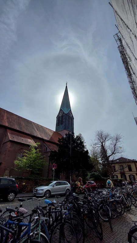 hier noch zwei Bilder aus Heidelberg, das sehr schön den (fast) vollständigen Halo-Kreis zeigen. Zu meiner Überraschung deutet sich auch ein 9°-Ring an, auf den ich visuell gar nicht geachtet hatte. Der 22°-Ring war auch nicht so "verschwommen", als dass pyramidale Kristalle zu vermuten gewesen wären. Wenn es nicht ein Artefakt der Smartphone-Bearbeitung ist (Samsung Galaxy A72), dann waren an diesem Tag kleinerflächig offenbar verschiedene "pyramidale" unterwegs...