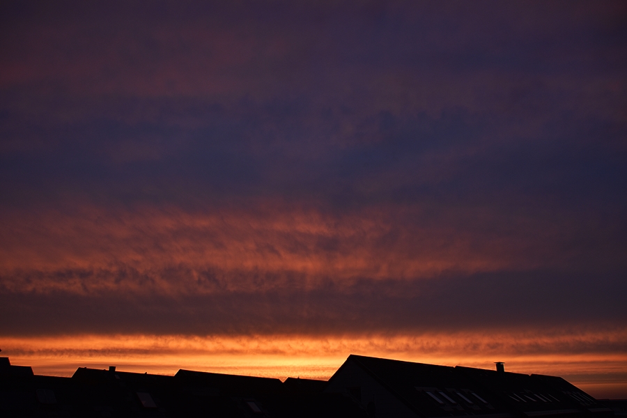 Die Aufnahmen entstanden zwischen 19:21 und 19:38 Uhr. Hier der Blick nach Norden. Die Wolken hatten in alle Himmelsrichtungen diese rosa Färbung.