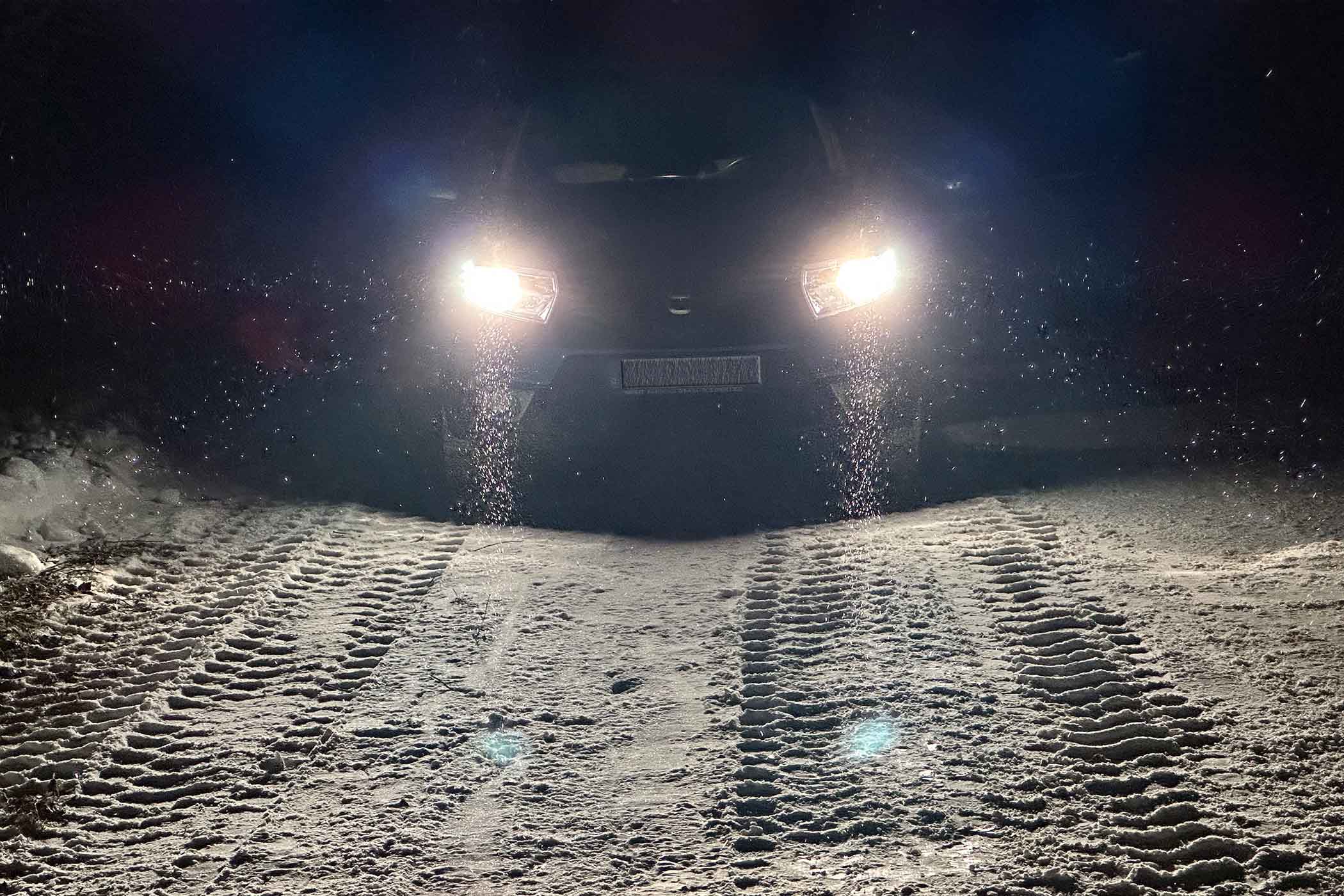 Ich habe mich um kurz nach 5 Uhr auf den Weg gemacht, damit ich vor Anbruch der Dämmerung dort bin und etwaige Mond- und Lampenhalos beobachten kann. Auf der Suche nach Eisnebel war ich zunächst in Mehlmeisel, aber ohne Erfolg. In der Nähe der Ortschaft Fleckl war schließlich erster schwacher Eisnebel. Der Erzeuger war mit hoher Wahrscheinlichkeit eine nahegelegene Schneekanone. Die Kristalldichte war für Mondhalos zwar zu gering, dafür konnte ich Halos an meinen Autoscheinwerfern sehen.