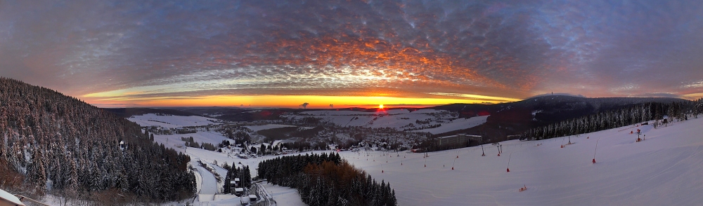 Die Panoramakamera von panomax.com an den Sprungschanzen in Oberwiesenthal zeigte ein phantastisches Bild vom Sonnenaufgang: