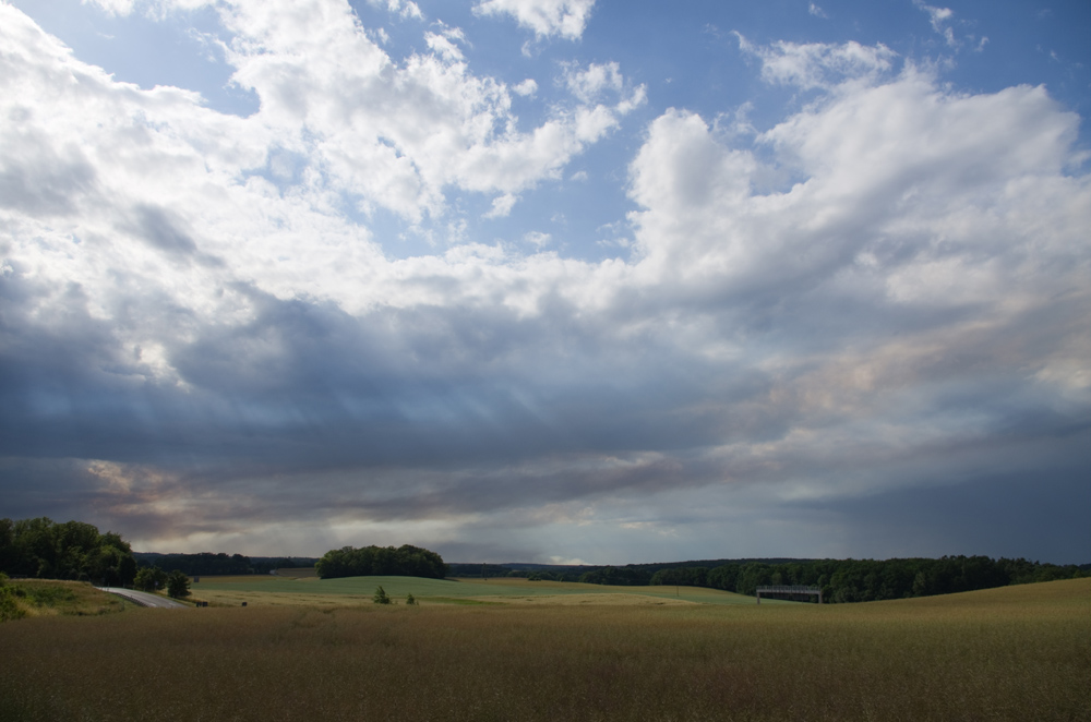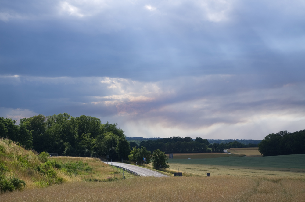 Ich habe noch etwas vom Dienstag, dem 27.06. (Siebenschläfer) nachzutragen. Auf dem Heimweg von der Arbeit an der A13 habe ich einige Wolken mit Sonnenstrahlen ("Crepuscularstrahlen") gesehen, einige Regenschauer waren da auch mit dabei. Interessant war aber der rötliche bis bräunliche Farbstich an manchen Stellen. Als ich das zuerst in Nähe des Horizonts gesehen habe, dachte ich zuerst an einen Regenbogen oder Halo, so geeicht ist man schon auf diese Farbnuancen.