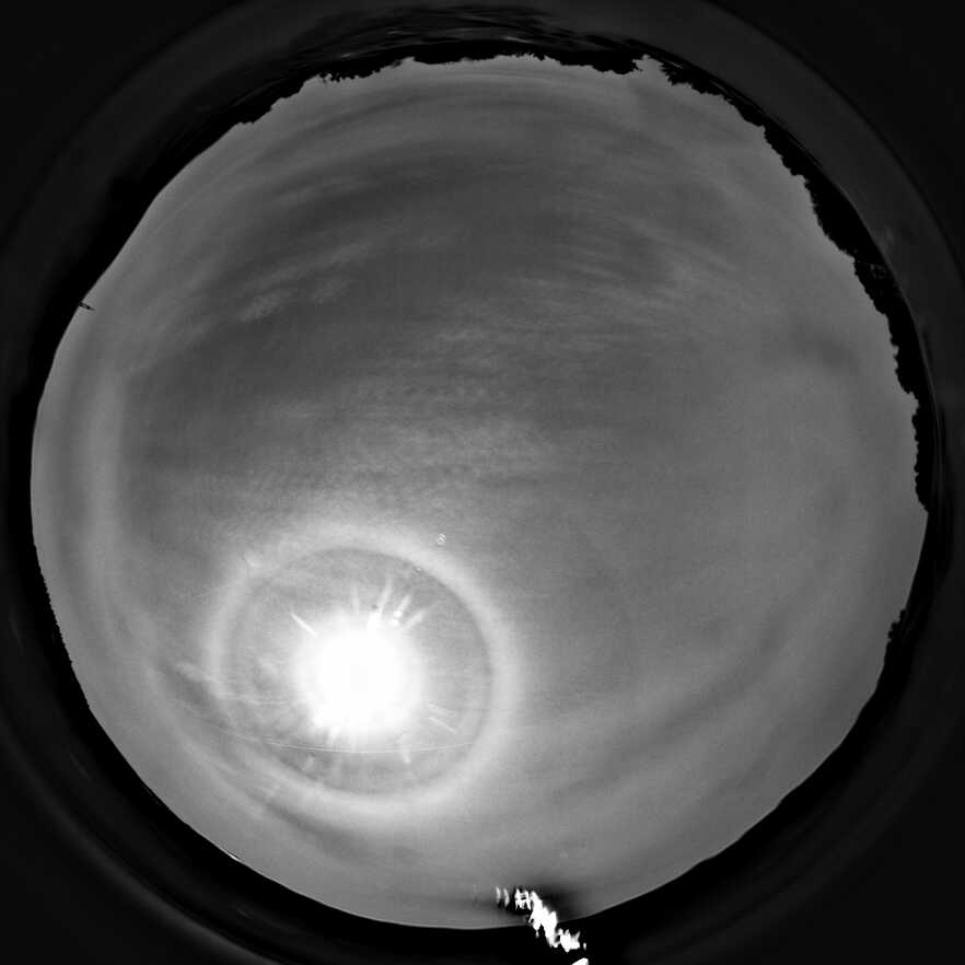 Glückwunsch zu den tollen Bildern. Den Pyramidal-Halo konnte ich auch von Frankfurt aus sehen, allerdings nur diffus den 22°-Ring. Leider hatte ich keine Kamera zu der Zeit parat, sodass ich hier nur eine Smartphone-Aufnahme um 14:06 Uhr habe: Zumindest mit der RB-Methode wird auch noch der 9°-Ring sichtbar: Wobei der 22°-Ring sehr breit wirkt, was visuell auch so in Erscheinung trat.