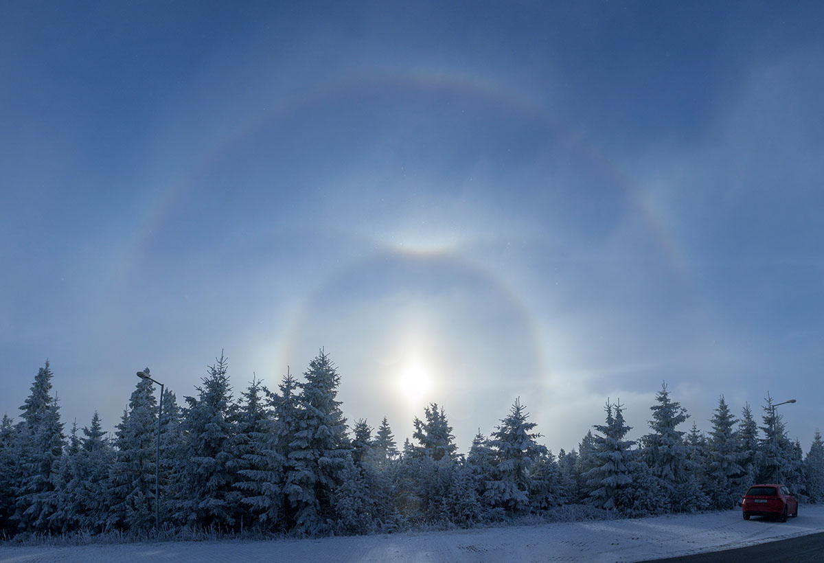 Insgesamt waren der 22°-Ring, der obere Berührungsbogen, die Lichtsäulen, der 46°-Ring und der Parrybogen zu sehen.