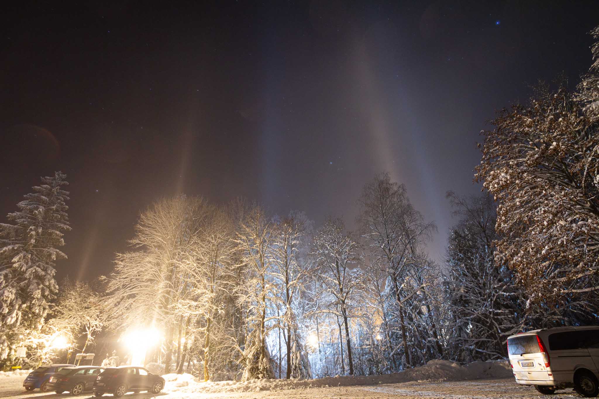 Prompt noch nicht weit sind mir kurz vor dem Waldrasthaus Karches an den Autos schon die riesigen Lichtsäulen an den sich nährenden Autos entgegengekommen. Kurz dort am Parkplatz angehalten die Lichtsäulen an den Lampen und Laternen fotografiert. Ich konnte es wieder nicht lassen noch ein bisschen mit dem Fernlicht am Auto zu spielen.