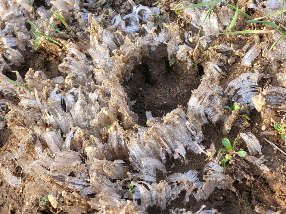 Seit den frühen Morgenstunden herrschte Dauerfrost. Das Feld ist an einem flachen Hang. Am späten Mittag hatten sich bei ca. – 3 Grad diese Eissäulchen aus dem Boden geschoben. Auf dem ersten Bild ist eine Fuchsspur in der Mitte.