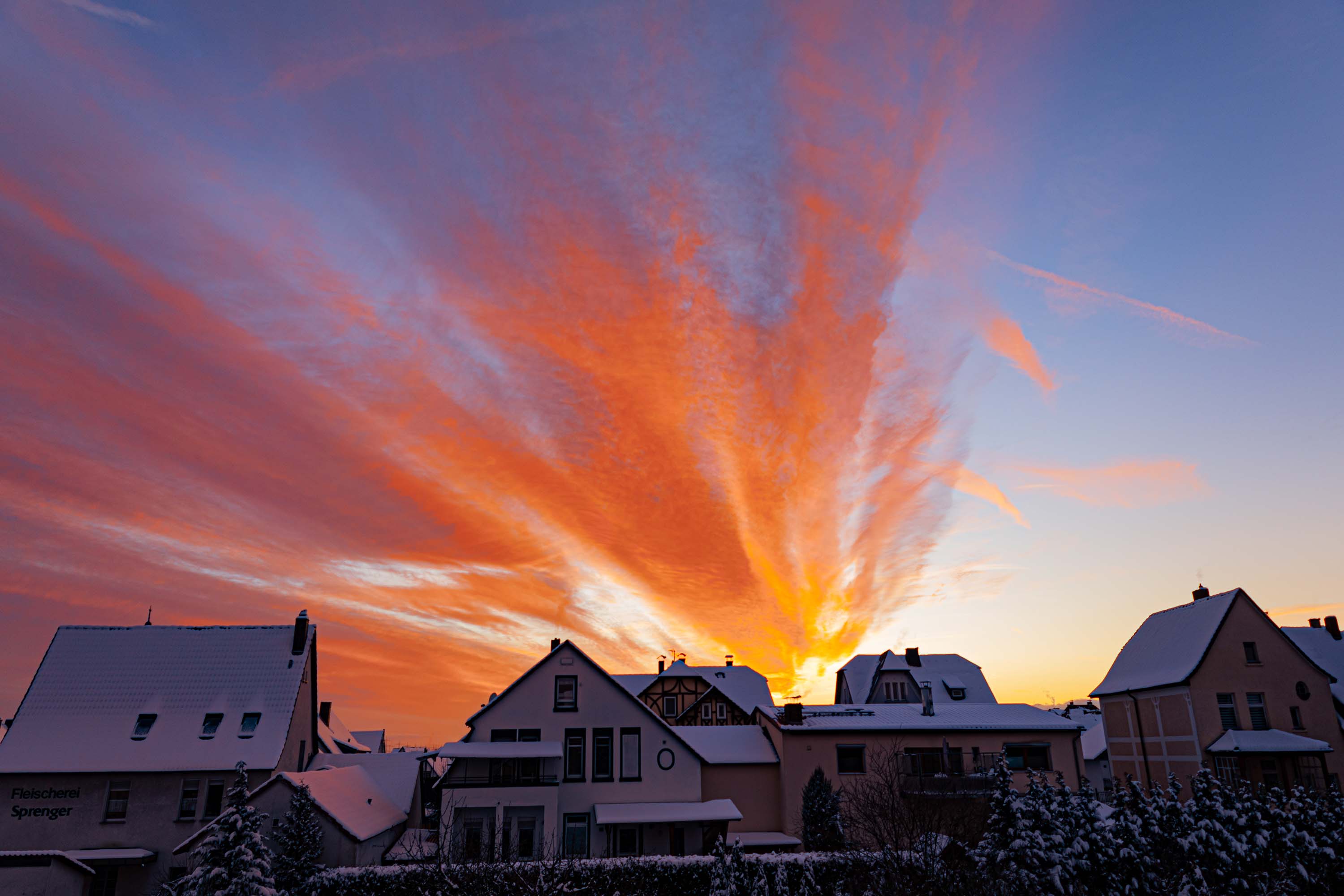 Heute Morgen gab es in Kirchhain bei -8°C ein wenig Morgenrot an Cirrus. Erst in rot: