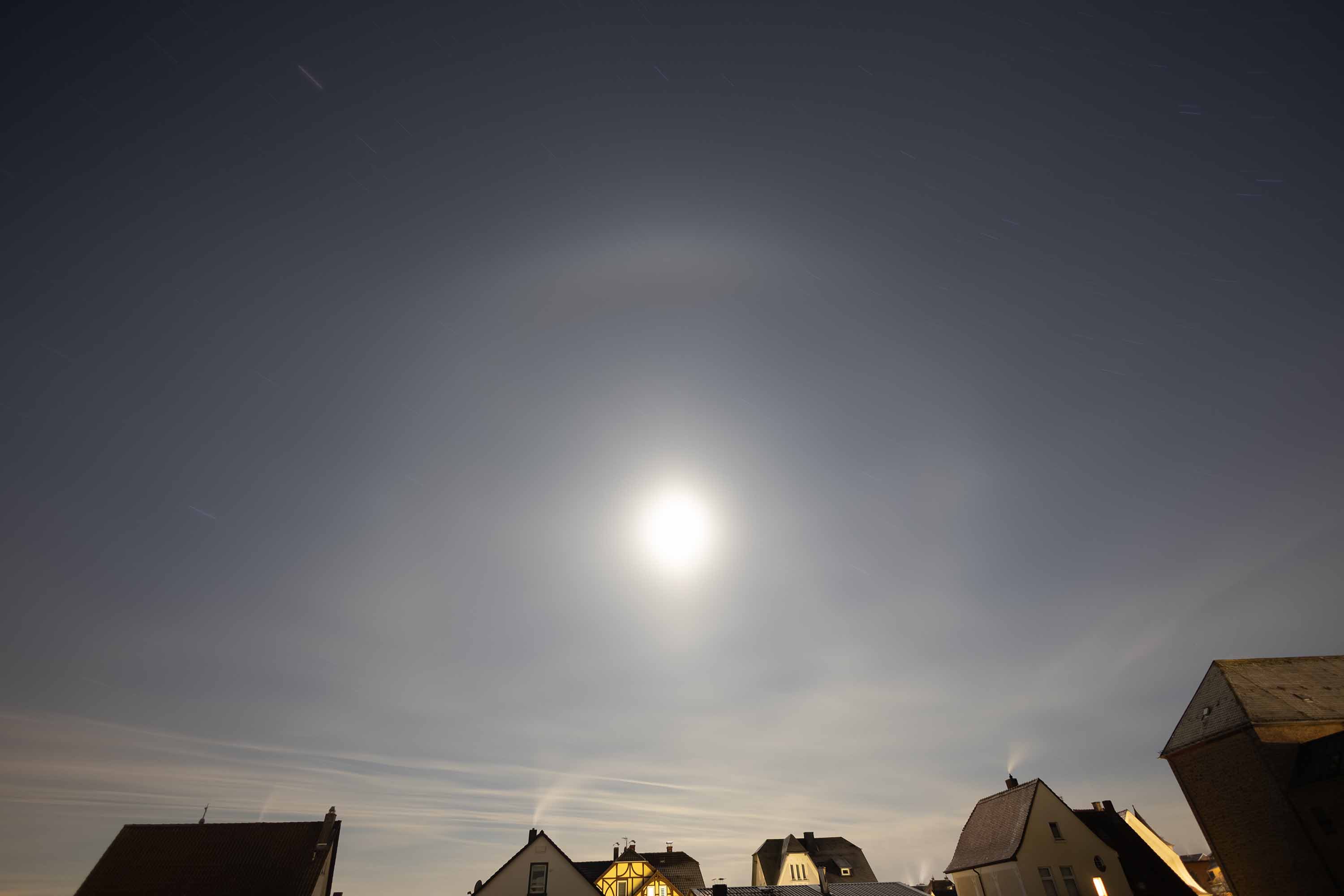 nachdem der Januar in Sachen Halos hier bisher ruhig ist (gestern gab es immerhin mal ein 22er und Nebenmonde am Mond), so gab es heute Nacht mal ein paar mehr Erscheinungen. Beobachtung konnte ich erst gegen 06:15 Uhr, davor war aber wohl schon großflächig Cirrostratus unterwegs. Eventuell habe ich da was verpasst (oder auch nicht, je nachdem). Zumindest fiel mir direkt ein 22°-Ring und auch sehr schwach der 9°-Ring, sowie ein relativ heller Parry auf:
