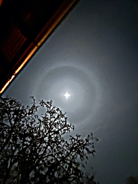 Die Beugungsringe im obigen Bild können übrigens auch Corona gewesen sein. Ich hatte in meinen Bildern auch Corona dabei. Wobei das helle Kreuz am Mond eher für ein Problem im Objektiv oder Sensor spricht.