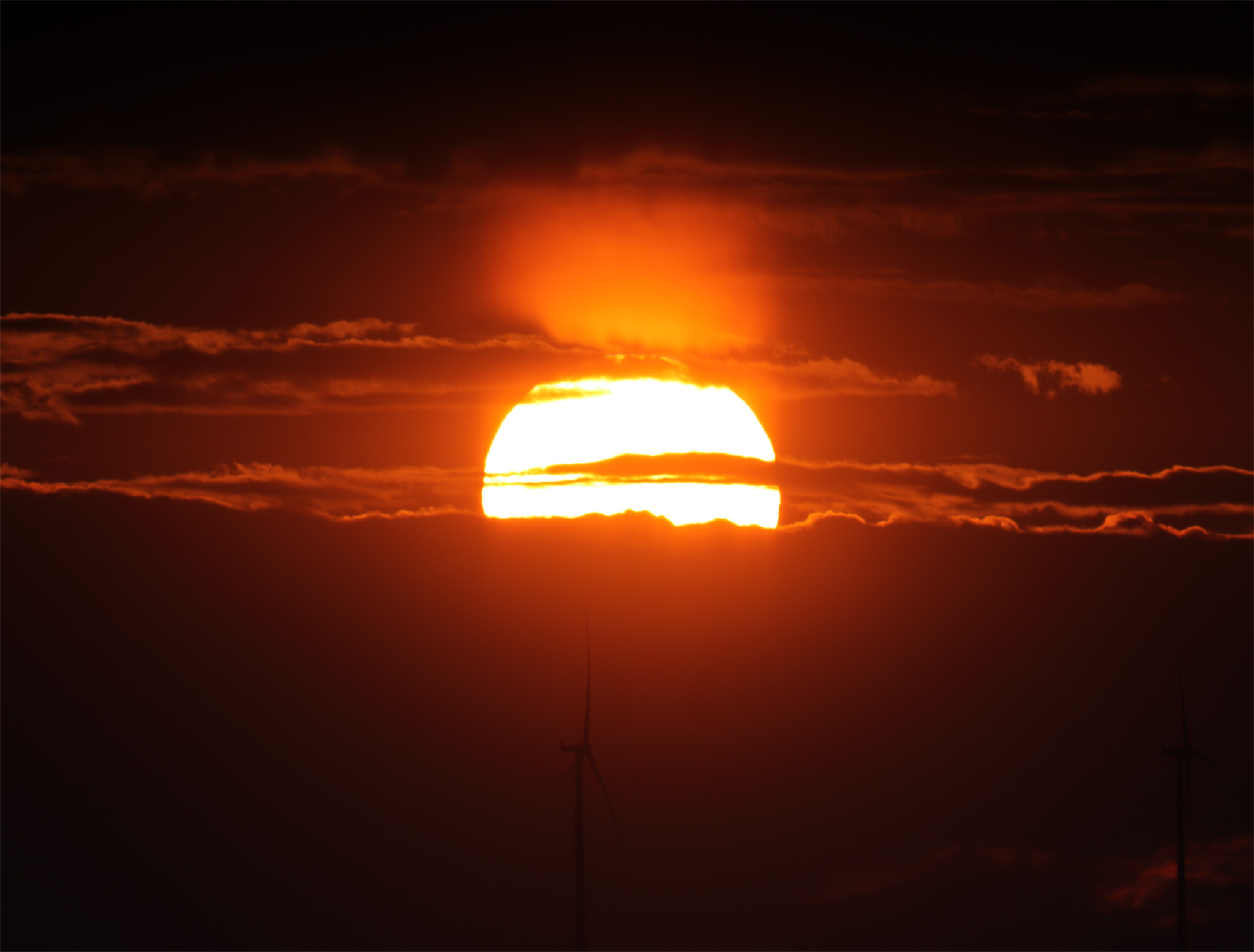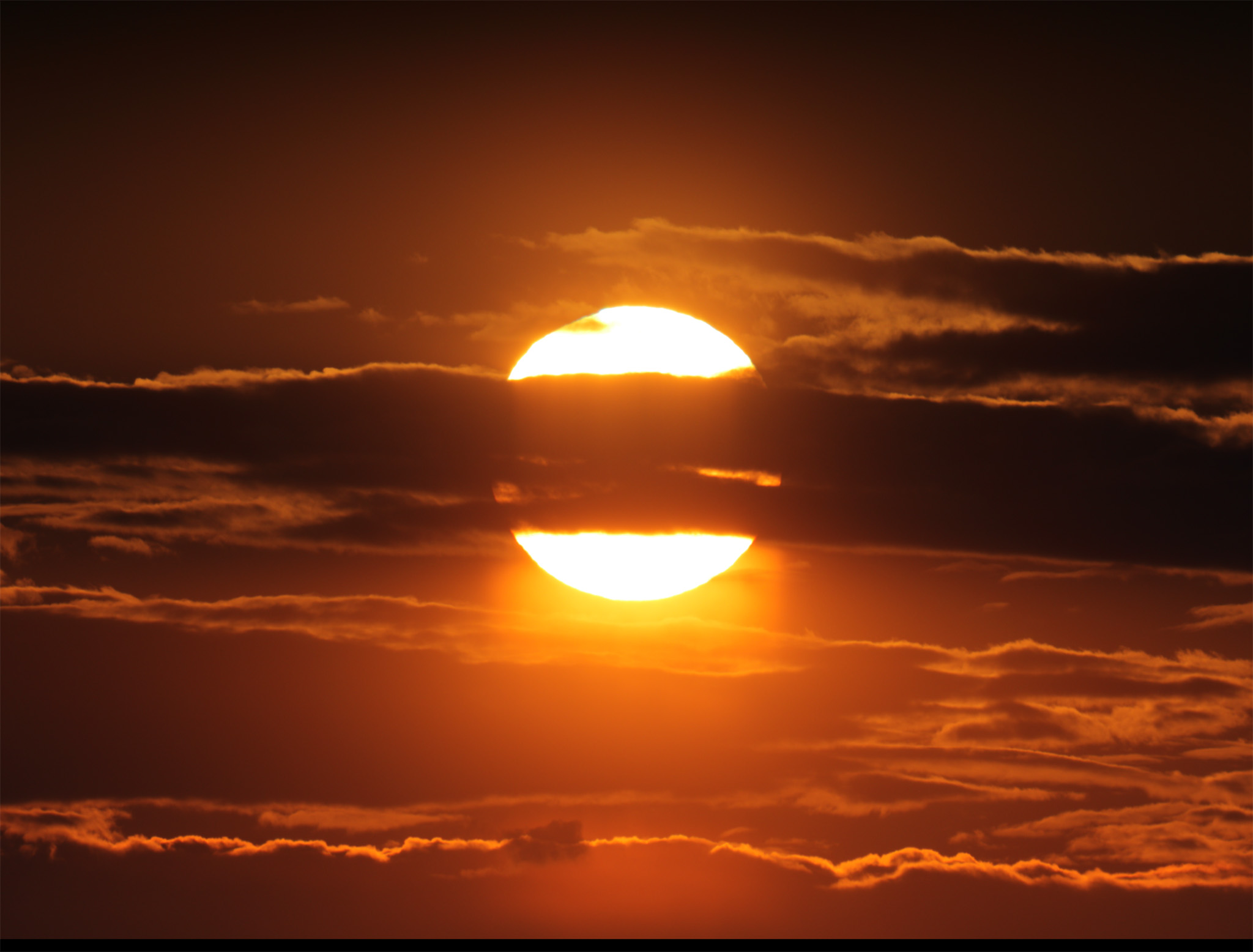Am 21.4. habe ich den Sonnenuntergang vom Niederrhein aus fotografiert. Ich stand auf einem Hügel, etwa 30 m über der Umgebung (könnte evtl. bedeutsam sein). Von Norden her fiel sehr kühle Luft ein. (ich war zu dünn angezogen). Zunächst sah ich unterhalb der Sonne einen Lichtfleck. Meine erste Idee war eine Reflexion in der Optik, aber ich konnte die "Doppelsonne" auch visuell beobachten. Später wechselte die Erscheinung innerhalb von 60-90 s nach oben. Dort hinterließen Wolken sogar Schatten darauf. Noch später wurde die Sonne von Wolken verdeckt, aber der Lichtpunkt blieb erhalten. Meine laienhafte Interpretation ist die, dass sich die Sonne an einer Luftfläche gespiegelt hat. Erst von oben, dann von unten. Kann das sein? Was ist eure Meinung? Gibt es so etwas öfter? Hat das einen Namen?