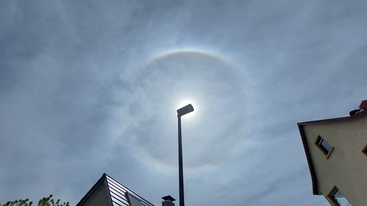 Am Sonntag zeigte sich hier in Heidelberg kurzzeitig ein vollständiger Horizontalkreis – schon lange nicht mehr gesehen! Er war nur kurz zu sehen, im Gegensatz zum restlichen Halo (k.A. – ca. 13:15 MESZ, dann von tieferen Wolken verschluckt).
