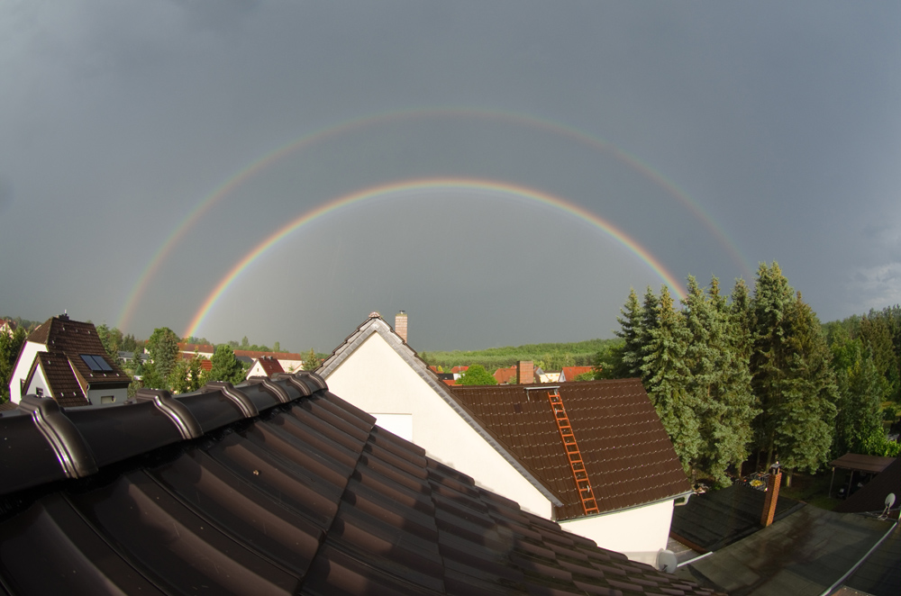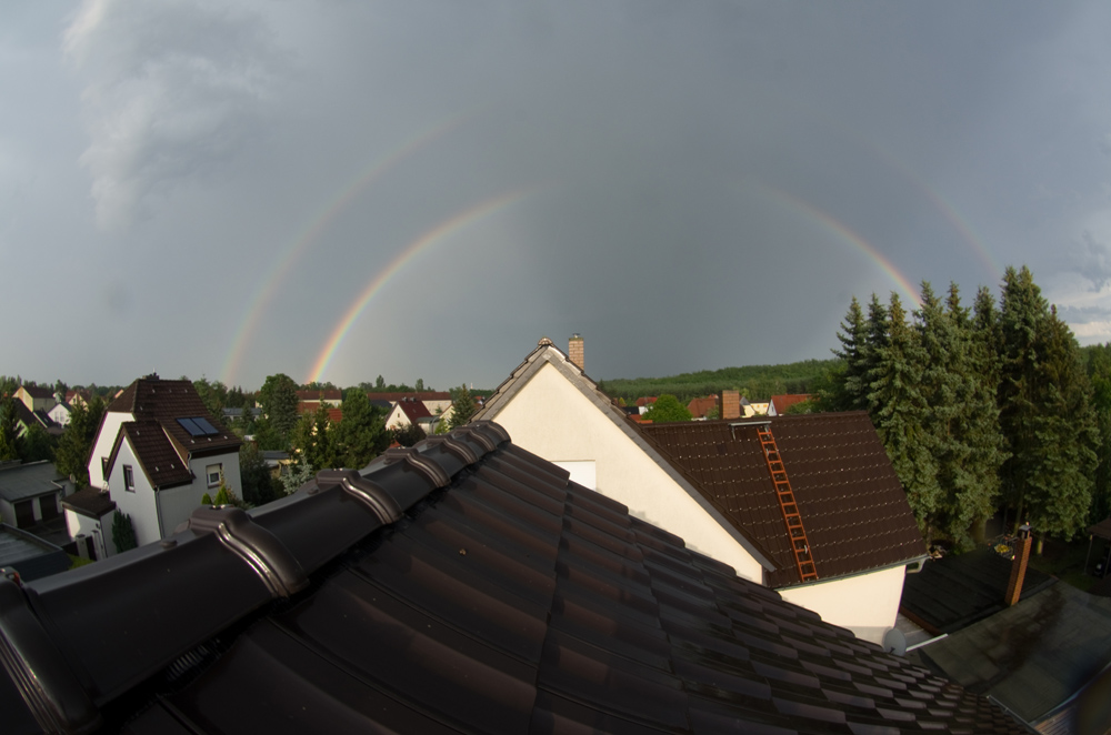 nach dem ersten Gewitterguss gestern abend war es mal wieder so weit. Erst ein "normaler" doppelter Regenbogen - aber mit selten gesehener Intensität, während es bei mir noch regnete. Der Scheitel des Hauptbogens zeichnete sich imer klarer ab und es wurden Interferenzbögen sichtbar. Dann plötzlich die Veränderung - die Intensität wurde oben schwächer und es sah eindeutig nach Spaltung aus. Kurze Zeit verschwanden die Regenbögen oben ganz, da muss eine Wolke Schatten geworfen haben. Danach wieder Hauptbogen mit Spaltung, aber diffuser. Anbei ein paar Bilder: