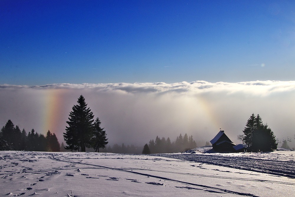 Wetter: Leichter Südostwind, Temperatur -2/-3°C, zerfallende Nebelfetzen der Nebeldecke über dem Böhmischen Becken waren der Ausgangspunkt.