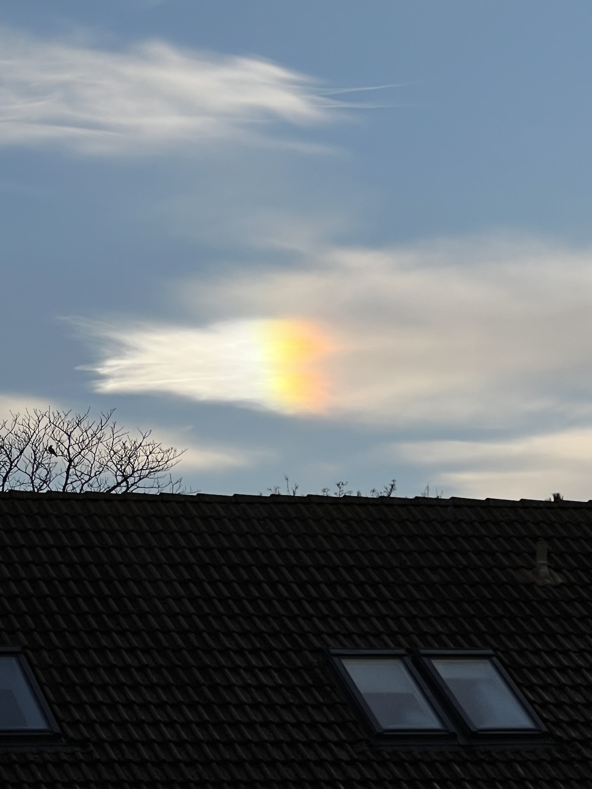 Zuerst war ein sehr schwacher ZZB zu erkennen (auf dem Handybild kaum auszumachen), dann gab es noch einige irisierende Wolken, sowie beide Nebensonnen. Alle Arten wechselten oft und auch die Intensität war recht unterschiedlich.